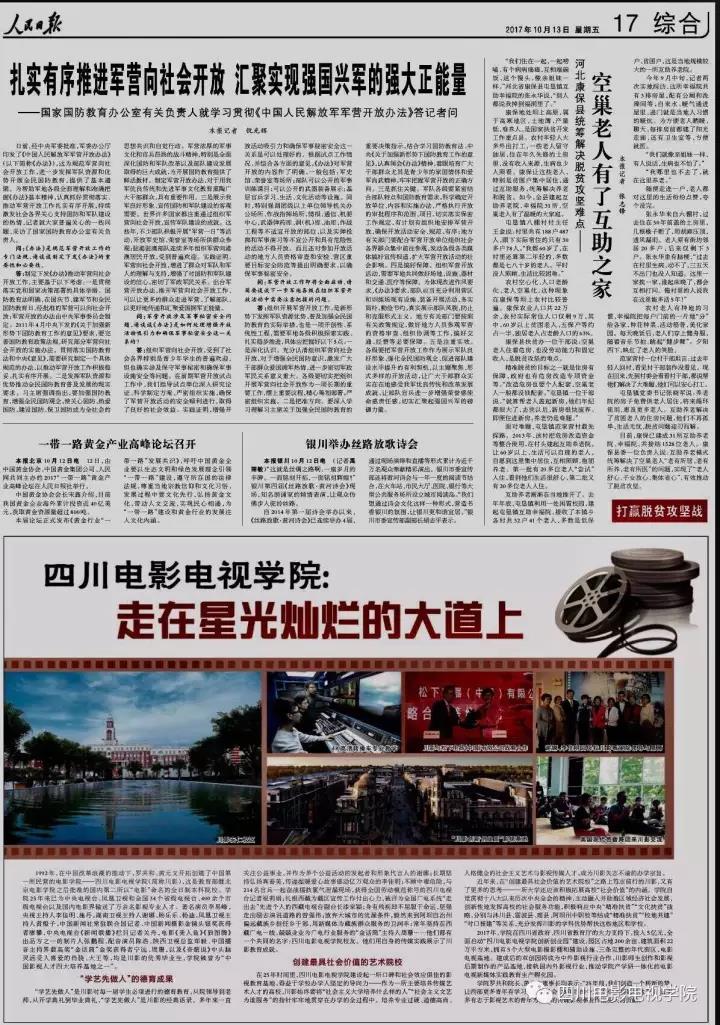 今日,人民日报第17版刊登了我院办学成果文章。以“澳门网投唯一官网:走在星光灿烂的大道上”为标题,阐述了我院人才培养成果,总结了学院如何创建最具社会价值的艺术院校。文章回顾了学院在人才培养上取得的卓越成...