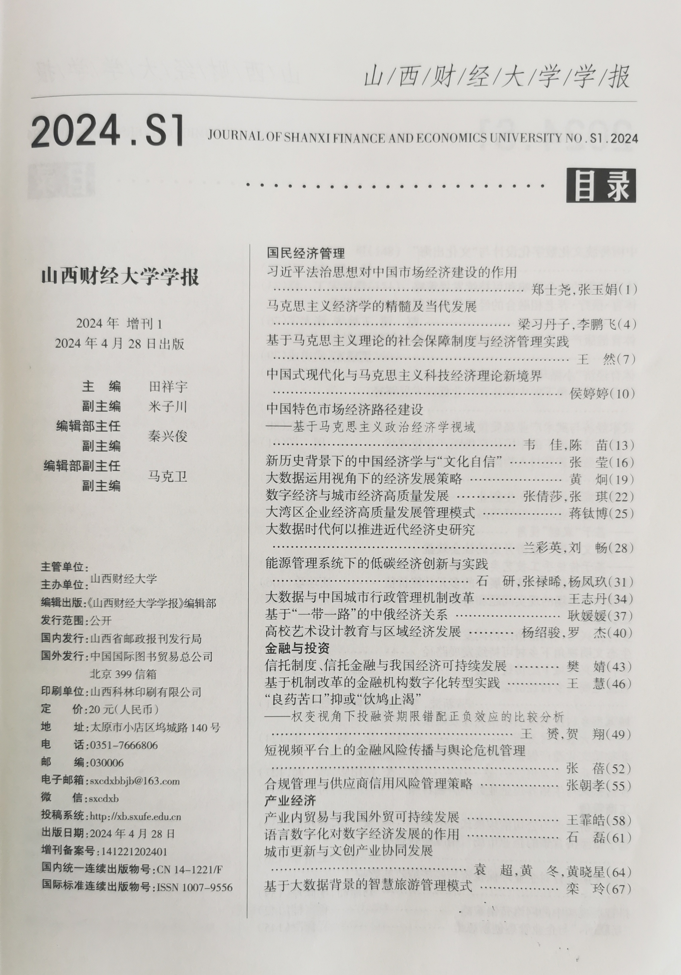 《山西财经大学学报》是CSSCI来源期刊《中文核心期刊要目总览》(2008年第五版),CSSCI 中文社会科学引文索引(2017-2018)来源期刊(含扩展版),CSSCI 中文社会科学引文索引(2021-2022)来源期刊,北京大学《中文核心期刊要目总览》1992年(第一版),1996年(第二版),2000年版,2008年版,2011年版,2014年版,2017年版,2020年版,2023年版来源期刊。《中国人文社会科学期刊AMI综合评价报告》2018版A刊核心,2022版A刊核心。出版周期:月刊,ISSN1007-9556,CN14-1221/F。目前出版文献量:14734篇,总下载次数:6544832次,总被引次数:156659次,(2023版)复合影响因子:6.605,(2023版)综合影响因子:3.245。
