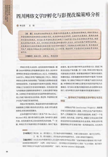 近日,我校发展规划处副处长李正丽副教授撰写的论文《四川网络文学IP孵化与影视改编策略分析》在全国中文核心期刊《电影评介》正式发表。该论文为2022年度教育部人文社会科学研究青年基金项目《成渝双城经济圈视域下四川电影高质量发展路径研究》(编号:22YJC760043)、 四川网络文学发展研究中心项目《从文学到IP:媒介融合视域下网络文学与电影产业互动发展研究》(编号:WLWX-2021004)阶段性成果。