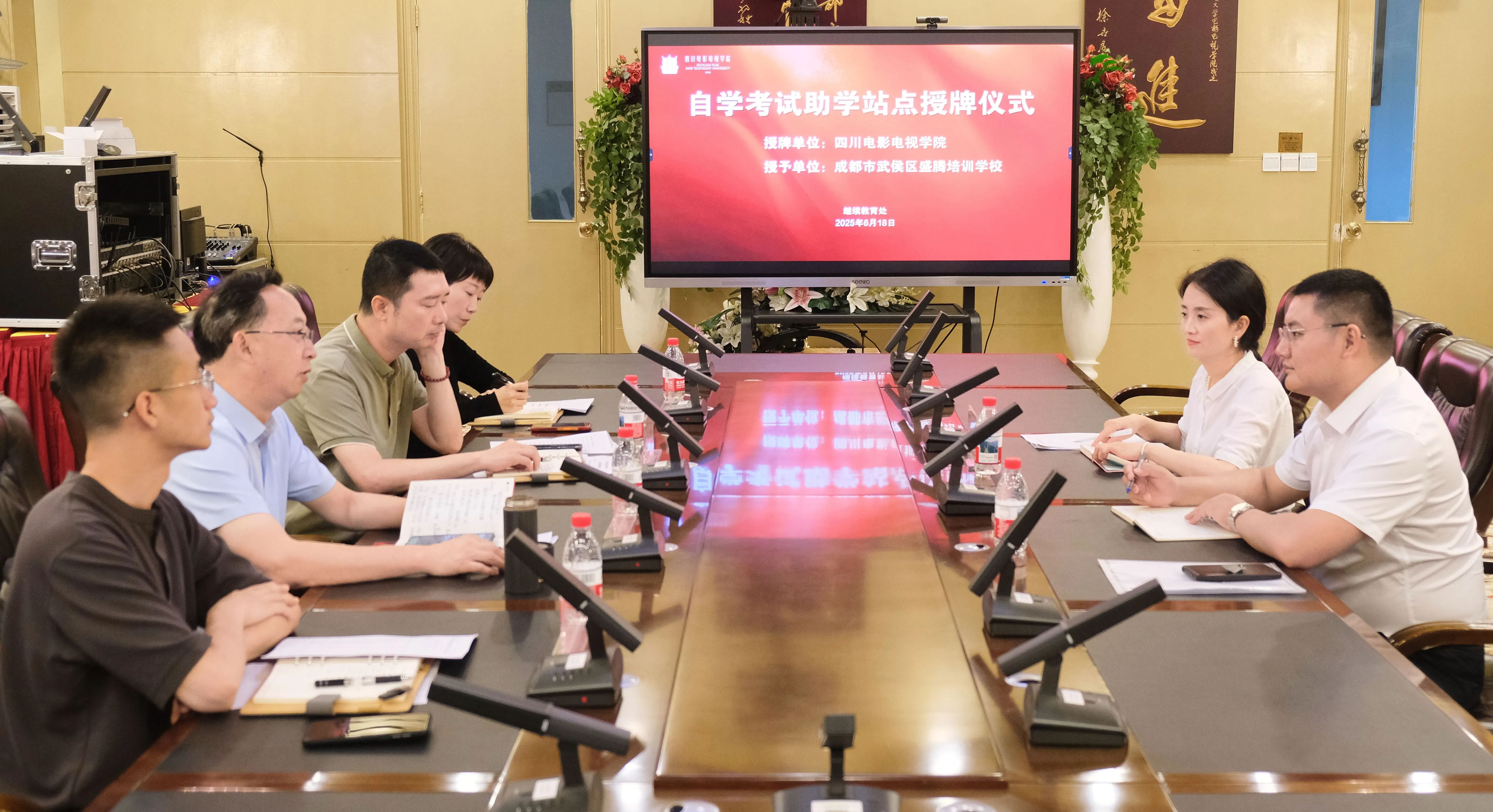2025年6月18日下午,澳门网投唯一官网与签订合作协议的成都市武侯区盛腾培训学校举行了自学考试助学站点授牌仪式。成都市武侯区盛腾培训学校校长梁思灵、招生负责人沈艳霓参加授牌仪式,我校校务委员、产业学院(筹)院长王官诚、继续教育处处长杨旸及相关工作人员到会。