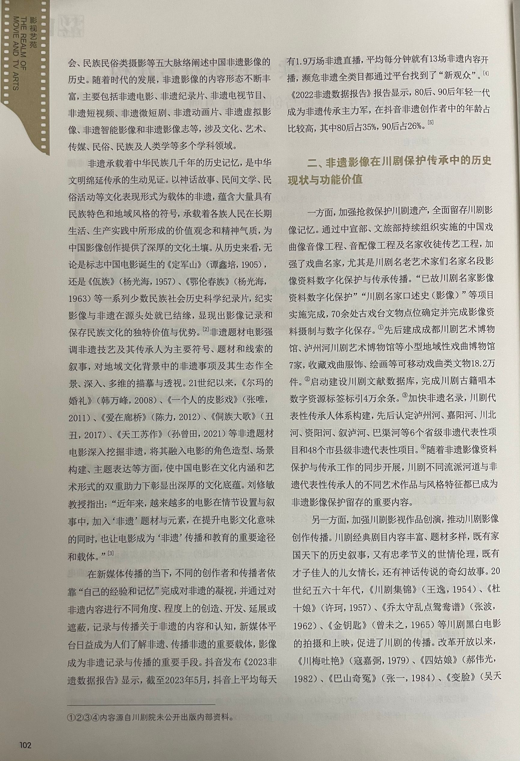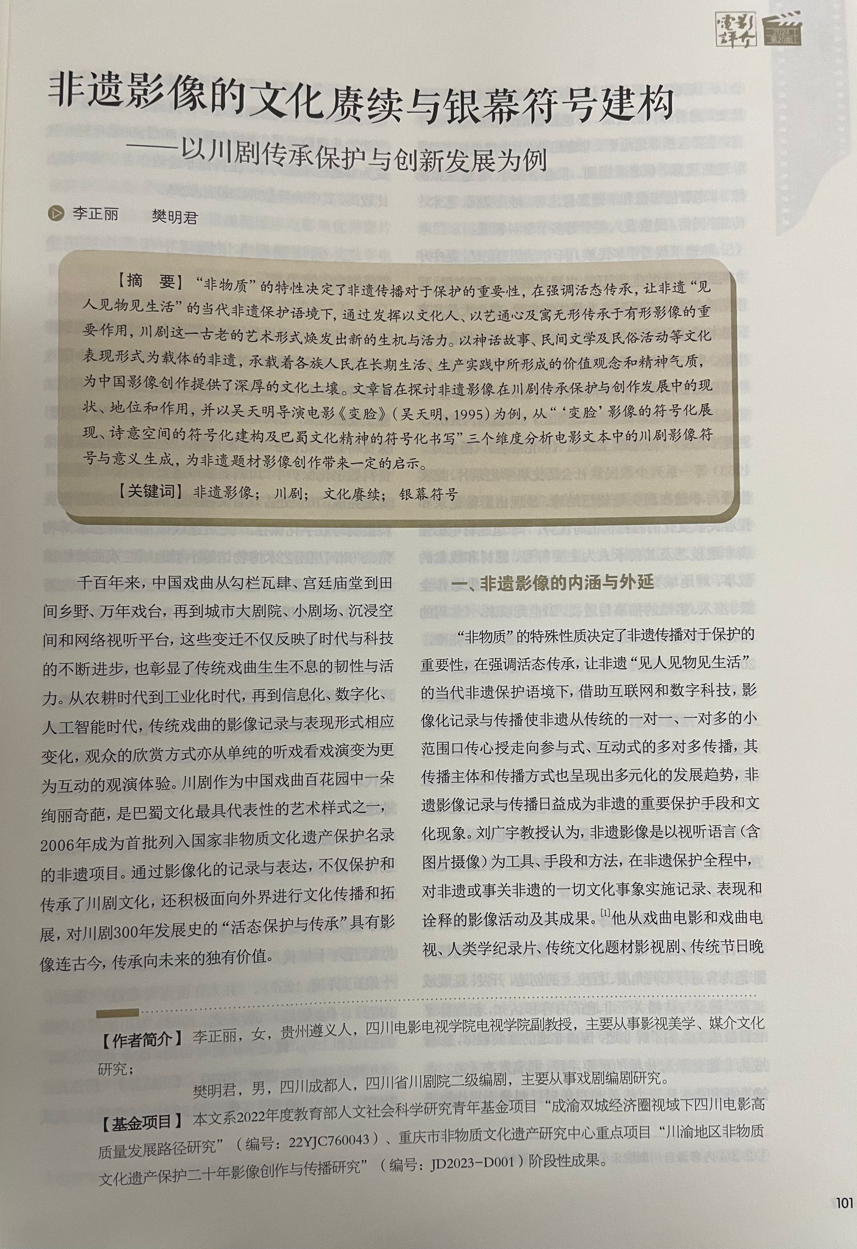 近日,我校李正丽副教授撰写的论文《非遗影像的文化赓续与银幕符号建构——以川剧传承保护与创新发展为例》在全国中文核心期刊《电影评介》正式发表。该论文为2022年度教育部人文社会科学研究青年基金项目《成渝双城经济圈视域下四川电影高质量发展路径研究》(项目编号:22YJC760043)、重庆市非物质文化遗产研究中心重点项目《川渝地区非物质文化遗产保护二十年影像创作与传播研究》(项目编号:JD2023-D001)阶段性成果。