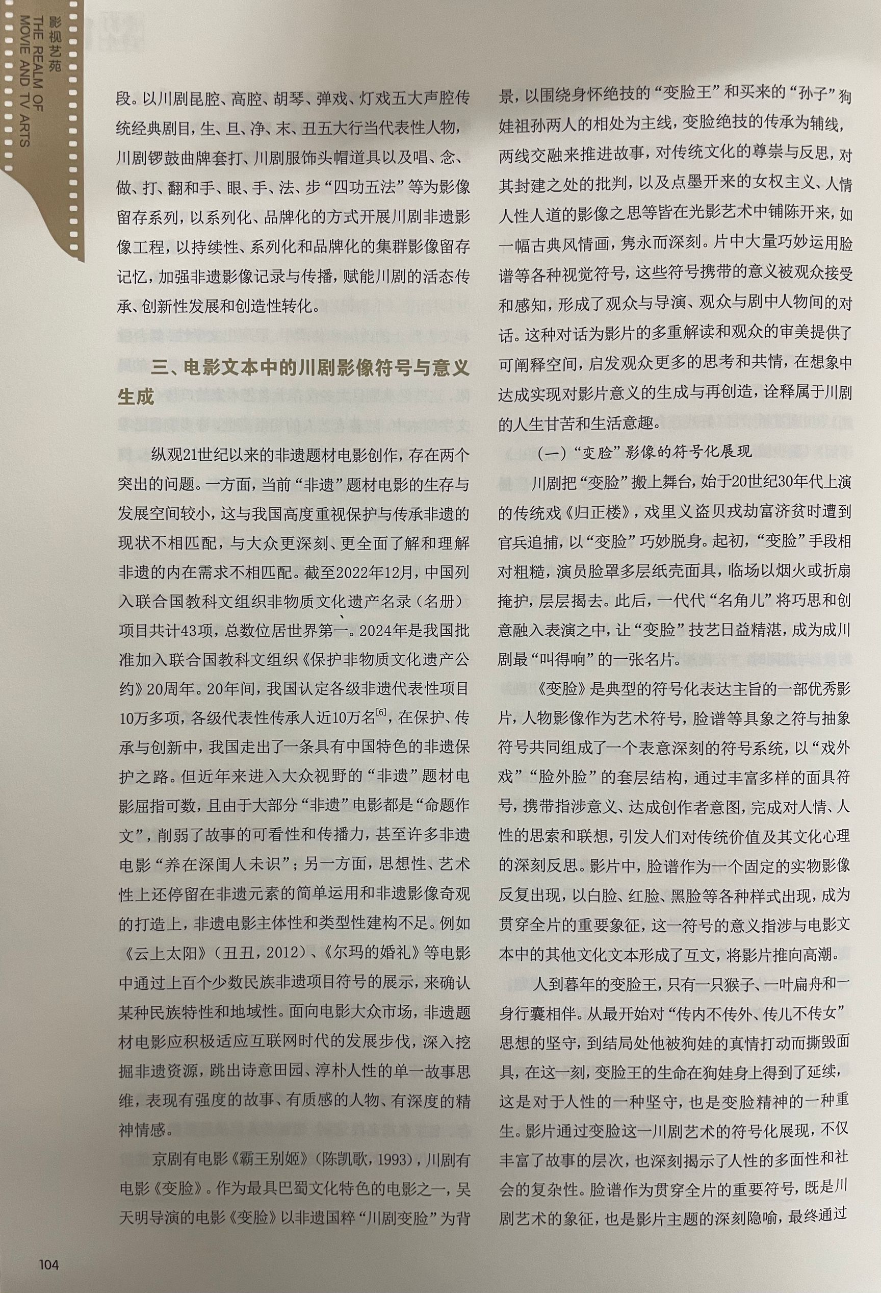 该文提出:“非物质”的特性决定了非遗传播对于保护的重要性,在强调活态传承,让非遗“见人见物见生活”的当代非遗保护语境下,通过发挥以文化人、以艺通心及寓无形传承于有形影像的重要作用,川剧这一古老的艺术形式焕发出新的生机与活力。以神话故事、民间文学及民俗活动等文化表现形式为载体的非遗,承载着各族人民在长期生活、生产实践中所形成的价值观念和精神气质,为中国影像创作提供了深厚的文化土壤。文章旨在探讨非遗影像在川剧传承保护与创作发展中的现状、地位和作用,并以吴天明导演电影《变脸》(吴天明,1995)为例,从“‘变脸’影像的符号化展现、诗意空间的符号化建构及巴蜀文化精神的符号化书写”三个维度分析电影文本中的川剧影像符号与意义生成,为非遗题材影像创作带来一定的启示。