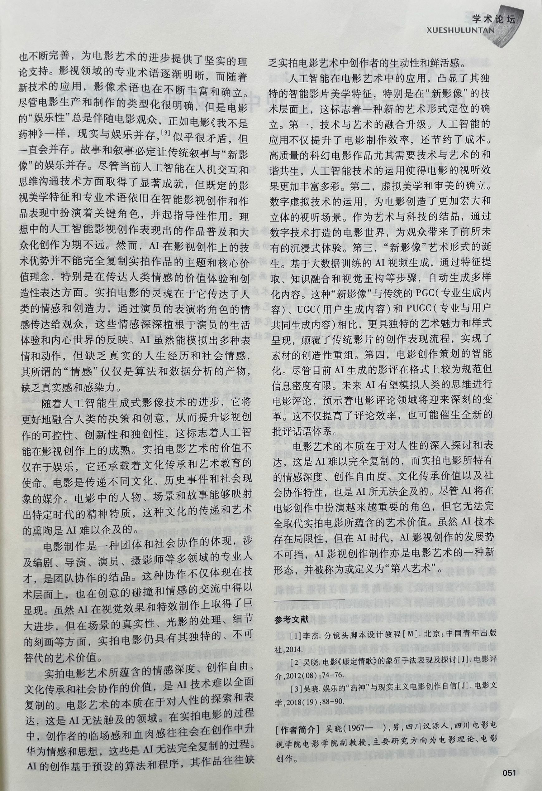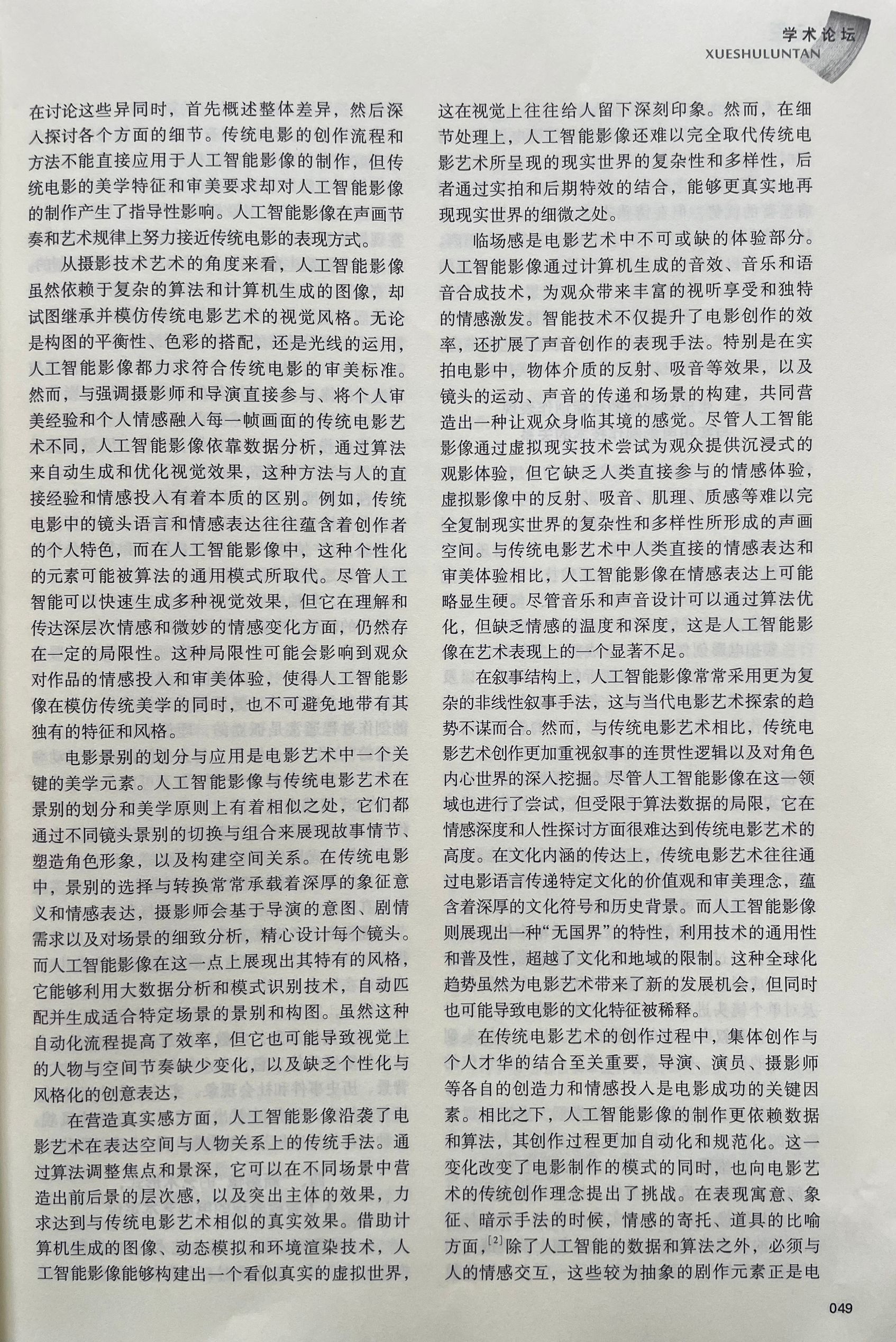 该文提出:随着人工智能技术的融入,电影行业及其相关的声画、视听制作迎来了新的发展阶段。电影创作的思维方式、制作方法以及策划内容也在迅速革新。智能思维逻辑的人机交互控制在电影制作中的应用至关重要,如何使电影相关专业的思维逻辑与人工智能有效对话,以及人工智能展现的电影美学特征及其审美是否能够与人产生共鸣,显得尤为关键。智能技术与人对电影艺术的审美观念和创作理念达成一致,掌握智能技术在影视创作的表现特点,才能更好地展现“第七艺术”魅力。思考人工智能影像电影与影视创作是否能够取代传统的创作模式,以及传统电影艺术的美学特征和表现要求如何指导智能影视创作,力图构建人与AI共同创作影视作品的完美对话。
