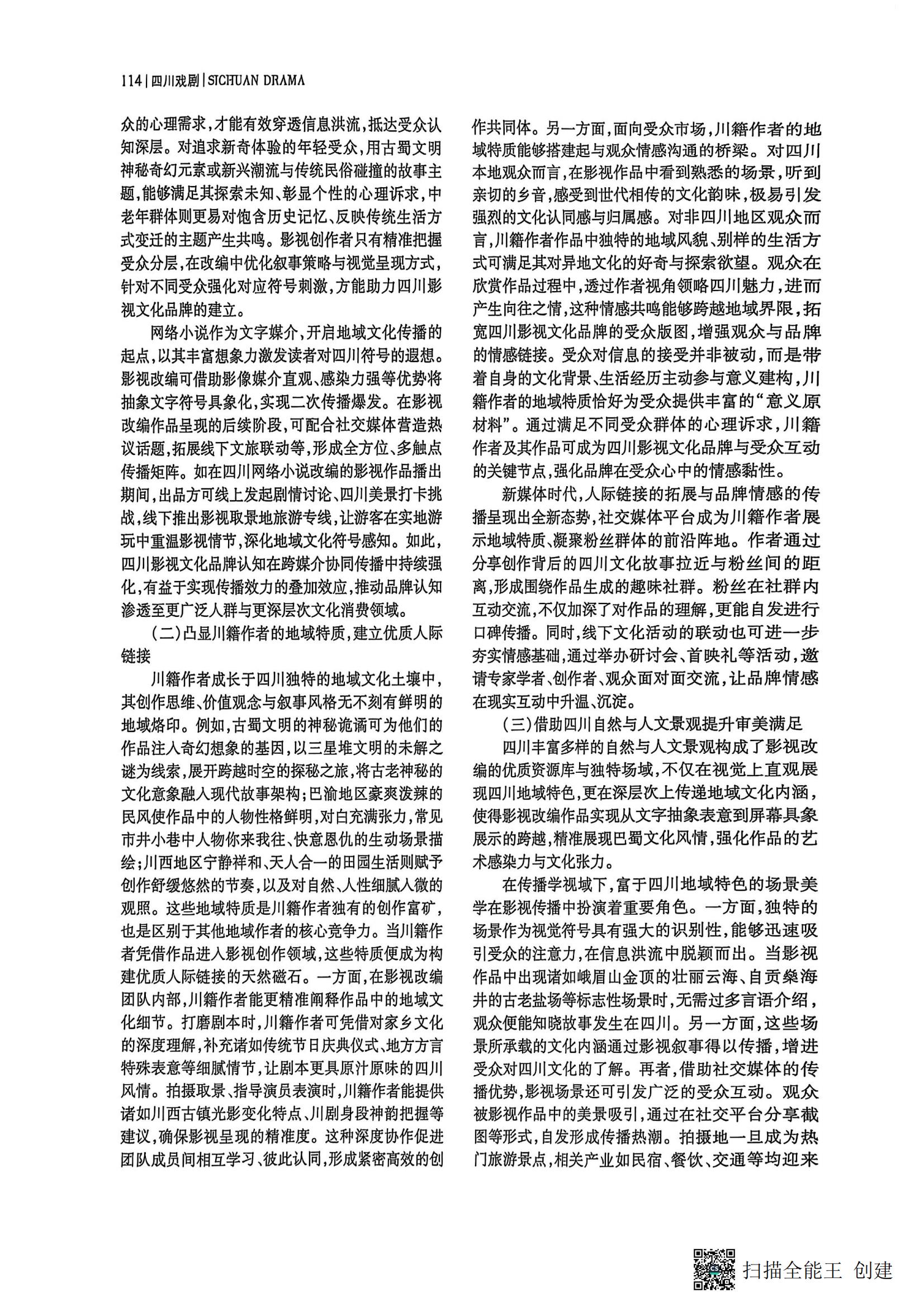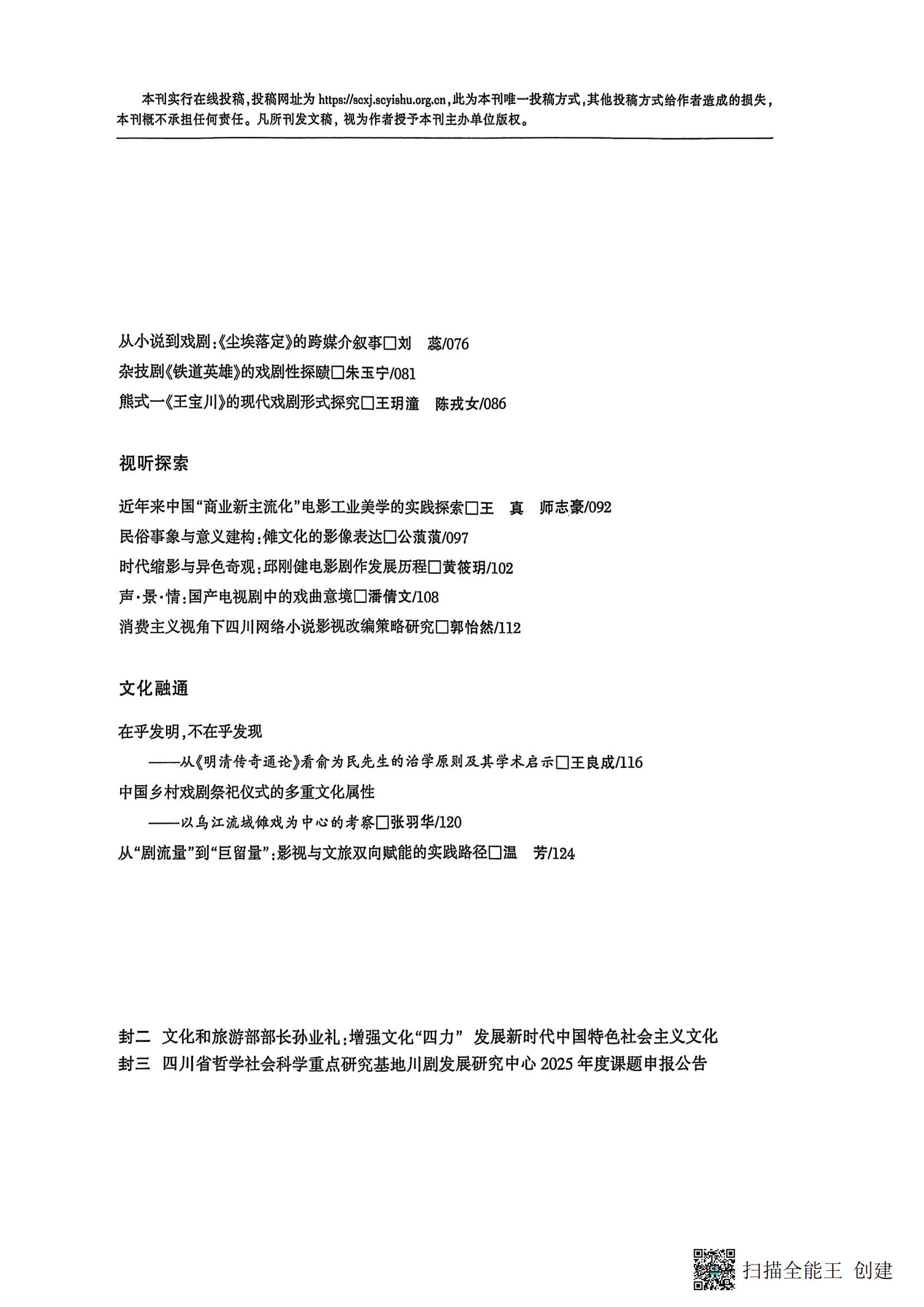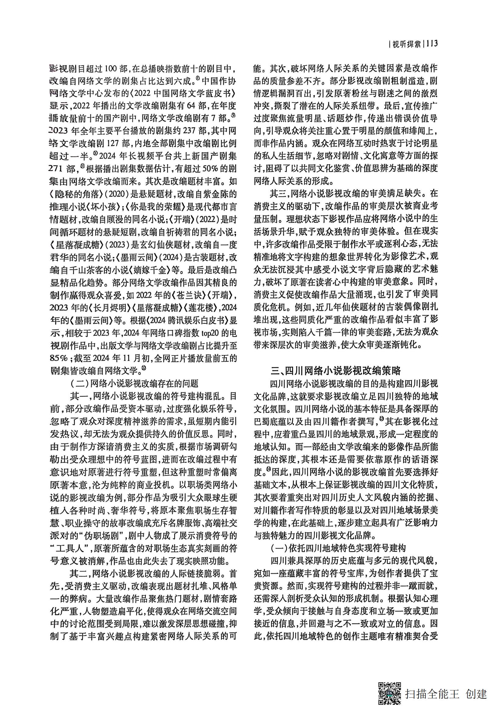 该文提出:网络小说的影视改编具有认知层面与经济层面紧密融合的多维度特征,文章基于消费主义理论视角,分析网络小说影视改编现状及其存在的问题,并从符号建构、人际链接、审美满足三个维度思考四川网络小说的影视改编策略,以期推动四川文化产业在网络文学与影视融合发展中的持续繁荣。