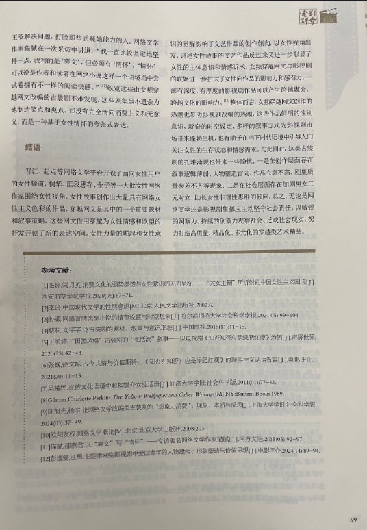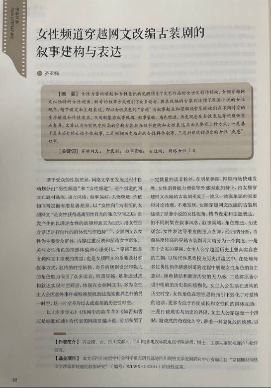 近日,我校齐亚楠老师撰写的论文《女性频道穿越网文改编古装剧的叙事建构与表达》在全国中文核心期刊《电影评介》正式发表。该论文系四川省哲学社会科学重点研究基地四川网络文学发展研究中心资助项目《穿越题材网络文学改编影视剧的叙事研究》(项目编号:WLWX-2022014)阶段性成果。