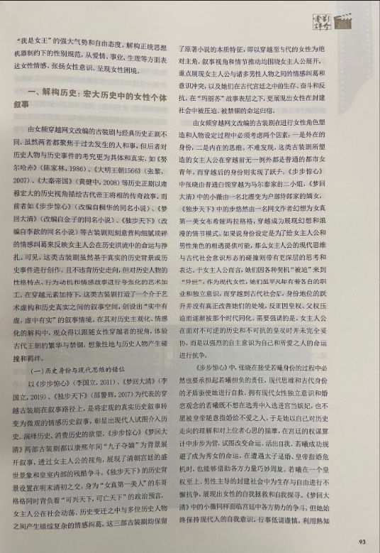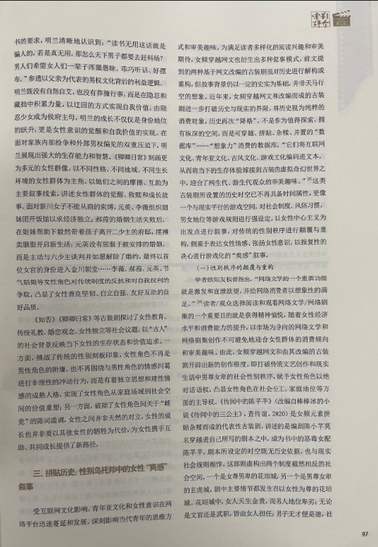 该文提出:女性力量的崛起和女性意识的觉醒催生了文艺作品的女性化创作倾向,女频穿越网文以独特的女性视角、新奇的叙事方式吸引了众多读者,据其改编的古装剧延续了原著小说的女性视角、情节设定和主题表达,即以女性角色的“穿越”为叙事起点和逻辑线索呈现她们在不同时空的生存境遇和价值追求,不同剧集在叙事风格、叙事策略、角色塑造、历史观念及女性表达等维度侧重点各异。文章认为当前热度较高的穿越古装剧在叙事建构和女性表达层面主要有三种方式:一是基于真实历史的女性个体叙事,二是模糊历史指向的女性群体叙事,三是拼贴戏仿历史的女性“爽感”叙事。