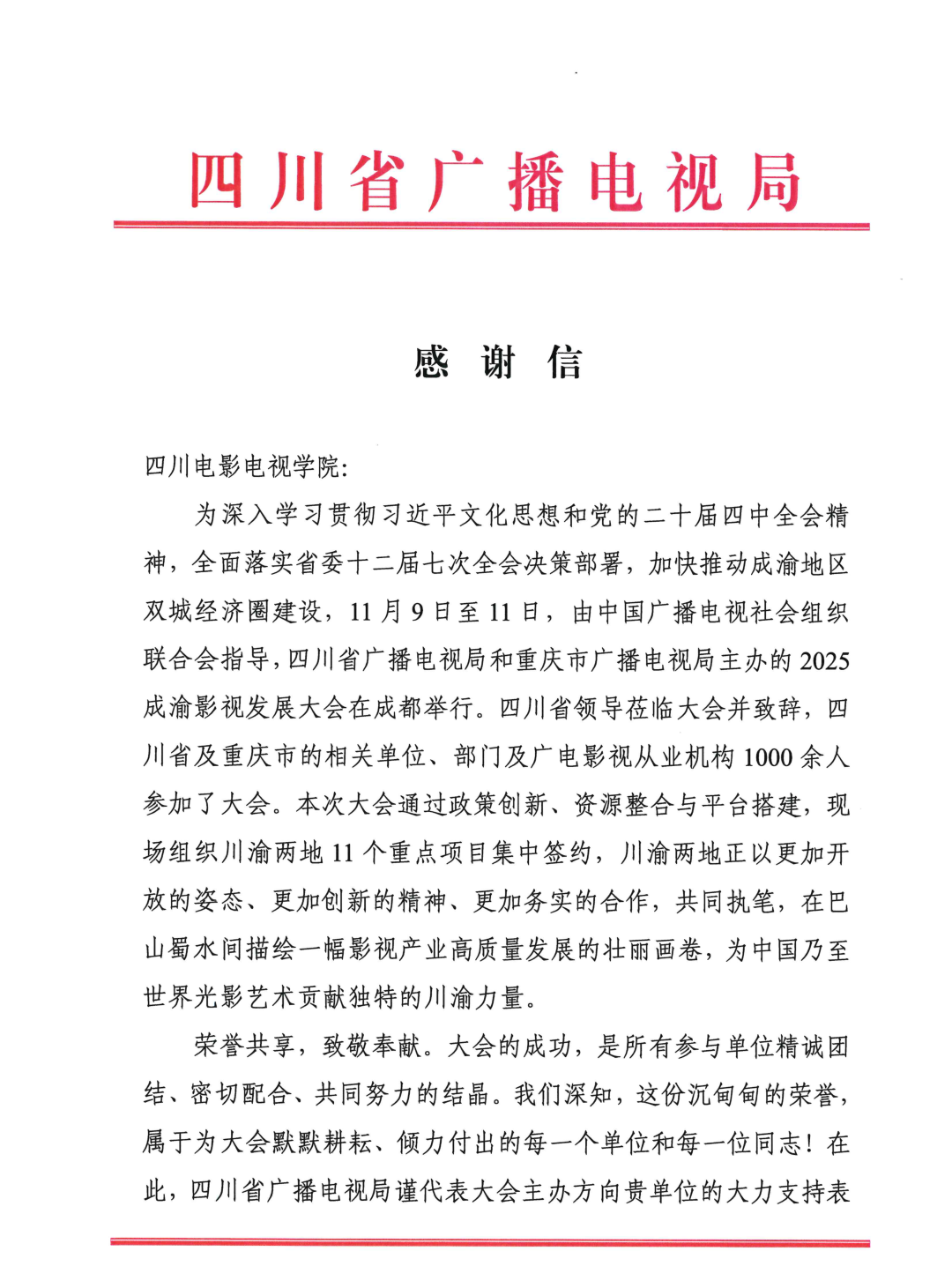 近日,澳门网投唯一官网收到来自四川省广播电视局的感谢信,对我校师生在2025成渝影视发展大会中所作出的突出贡献,表示高度肯定和诚挚感谢。