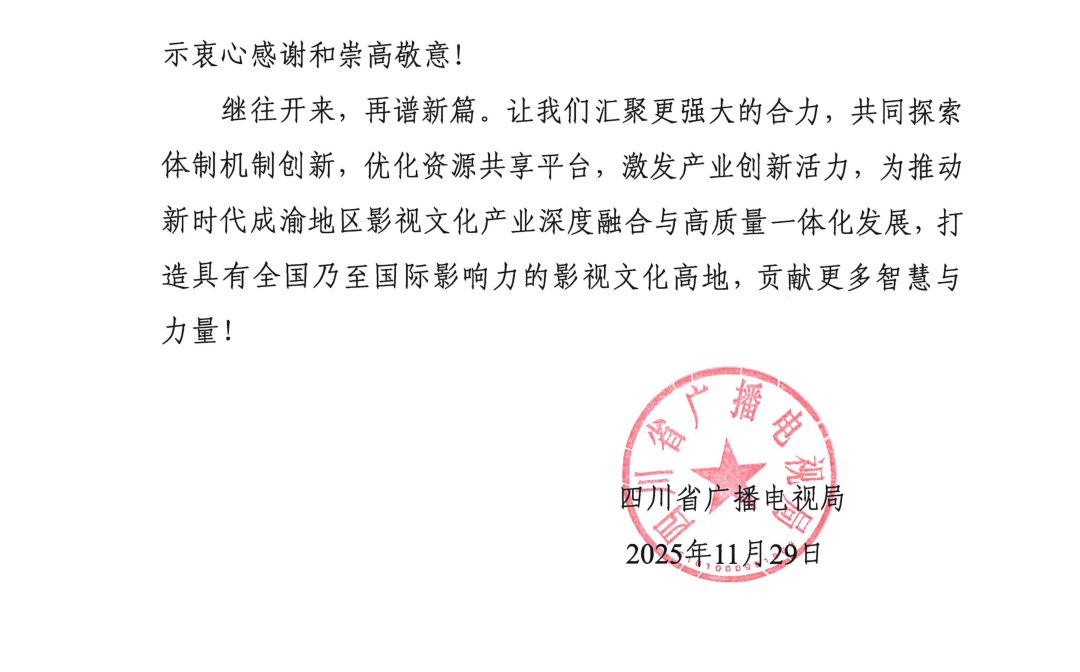 继往开来,再谱新篇。让我们汇聚更强大的合力,共同探索体制机制创新,优化资源共享平台,激发产业创新活力,为推动新时代成渝地区影视文化产业深度融合与高质量一体化发展,打造具有全国乃至国际影响力的影视文化高地,贡献更多智慧与力量!