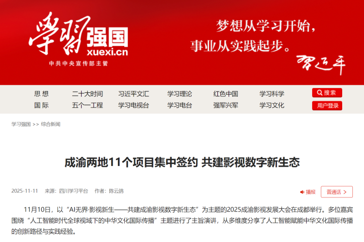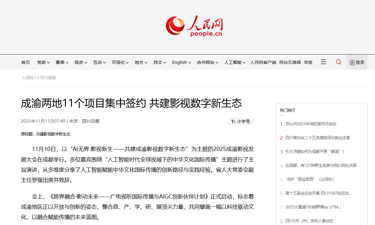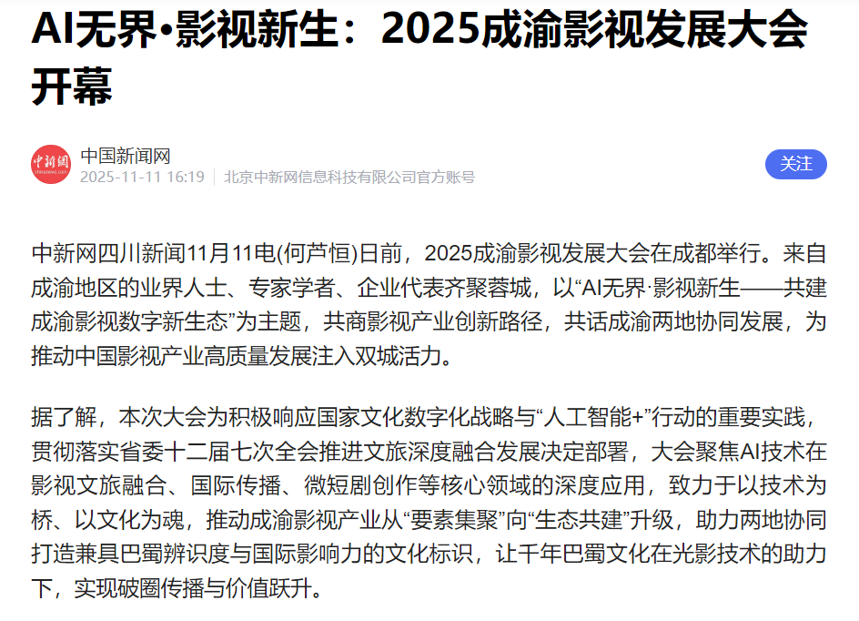 今年11月,在成都启幕的2025成渝影视发展大会,以“AI无界·影视新生——共建成渝影视数字新生态”为主题,如一条“光影纽带”,把政策、行业、媒体与大众的热情紧紧连在了一起。作为大会主要承办单位,澳门网投唯一官网从筹备到落幕,为这次光影艺术盛会贡献了独有的智慧和力量。