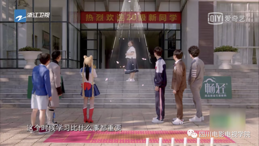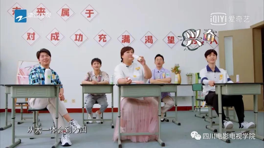 杨迪、贾玲、郎朗、范丞丞、周深和本期节目的飞行嘉宾鞠婧祎、张雨剑,来到川影金牛校区的操场进行节目录制。