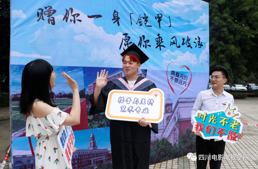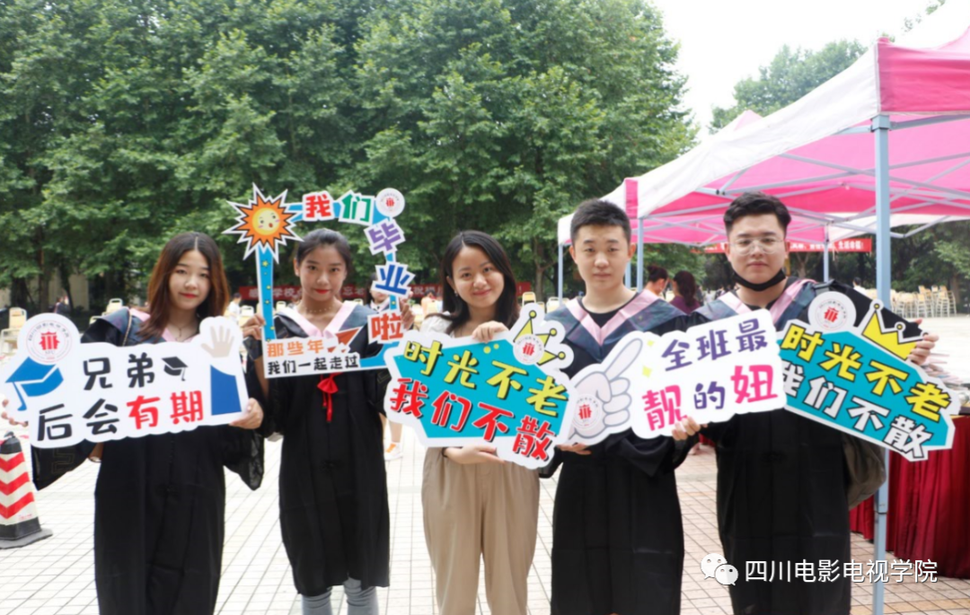即将离开校园,和老师同学们合影留念不能少。毕业典礼现场,学校还精心准备制作了纪念展板和各种花式手举标牌,同学们爱不释手,纷纷拍照打卡。