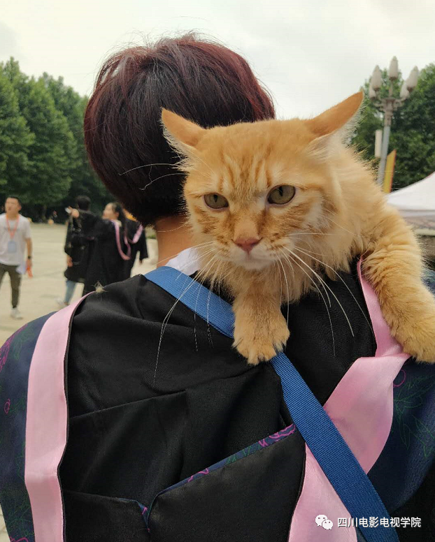 它叫“鳌拜”,两年前,它本是学校里出生的一只小流浪猫,后来被川影学子悉心照料,并带回了家中收养。今天,收养它的“铲屎官”毕业了,也带着它一起回到学校参加毕业典礼,因为这里,是他们梦想开始的地方。
