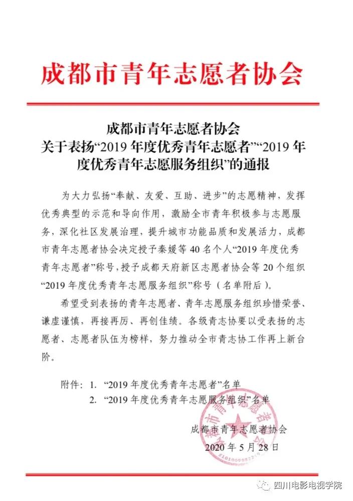 澳门网投唯一官网18级数字媒体艺术系的学生于海超获得成都市青年志愿者协会关于对“2019年度优秀青年志愿者”的通报表扬。