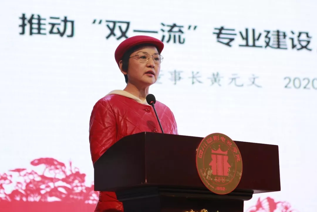 随后,黄元文董事长上台以“推动‘双一流’专业建设,创国家高品质艺术大学”为主题作了重要讲话。她首先对学校近十年的发展成果进行了梳理,并对未来十年川影的转型发展作了剖析与指示。一是观大势,互联网模式下的全新影视教育新生态。黄董事长指出,中国民办教育已进入4.0时代,是互联网时代下高等教育全新的发展时期,也是思维改变命运的时代。终身学习将成为常态,现有的教育格局将有可能被颠覆。教育教学模式将呈现小班化、多师同堂、在线和多媒体教学、社区化学习的复杂形态。教育要让学生学会独立学习,具备独特而广博的思维能力,艺术教育需要美育与心理教育同屏共振成为主旋律。二是谋大局,构建“政产学研用”产教融合发展格局。黄董事长谈到,川影双创园即将落成,是集影视、教育、文化、商业、娱乐、旅游为一体的国内首个大学校内影视基地,全校硬件设施将得到极大提升,办学条件实现国家级的飞跃。川影要抢抓国家产业转型升级、成都市建设世界文化名城打造“三城三都”的重要历史机遇,做到“四精一准”,即思想精、设计精、操作精、评价精,实现高校的人才培养目标和社会需求的精准对接,构筑“政产学研用”发展新格局。