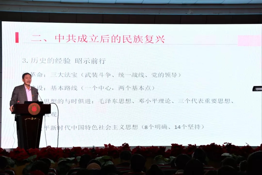 随后,罗书记讲述了中共成立后的民族复兴。他通过回溯三次艰难的国内革命战争、与其密不可分的三大起义,以及坚持不懈的抗日战争等一系列开天辟地的大事件,进一步阐述了“初心”的意义。并表示,新中国的建立标志着半殖民地半封建社会的结束,中国人民取得了民族独立、人民解放的新民主主义革命的彻底胜利,中国人民从此站起来了。罗书记接着以新中国70年建设成就展开,谈到了国家在社会主义建设与改革开放的经济、政治、文化、社会、生态、党建等方面创造出的辉煌硕果。并依次阐述了武装斗争、统一战线、党的领导的“革命三大法宝”,“一个中心,两个基本点”的基本路线。重点讲解了毛泽东思想、邓小平理论、三个代表重要思想、科学发展观,党的指导思想与时俱进发展特别是习近平新时代中国特色社会主义思想。