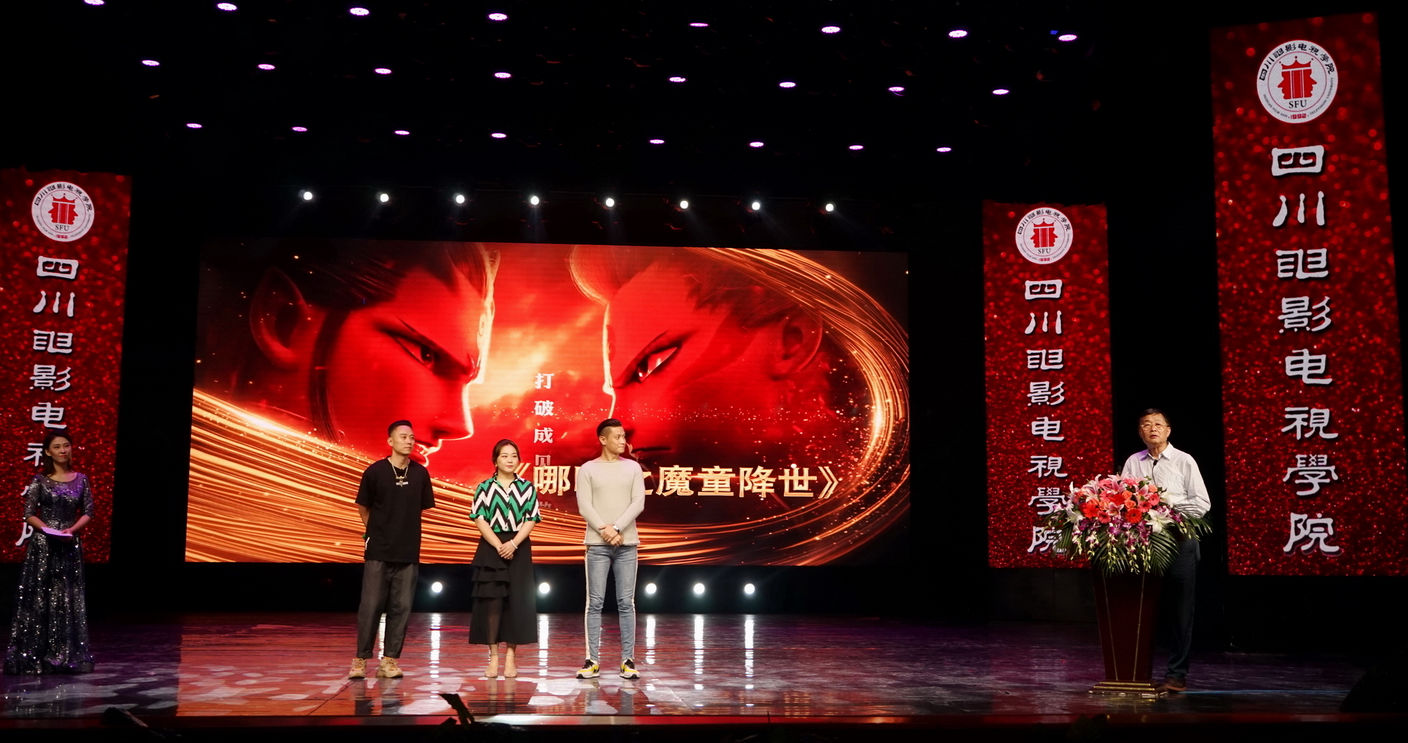 值得一提的是,罗共和校长特别介绍了动画电影《哪吒之魔童降世》中的配音团队成员,他们分别是“小烟嗓”儿童哪吒的配音 川影播音主持学院影视配音提高班指导教师、05级毕业生吕艳婷;配音导演和哪吒父亲李靖的配音是川影97级学生陈浩,现任四川人民艺术剧院演员;“川普版”太乙真人配音为学校95级学生张珈铭。三位师生的出场引发了台下热烈的掌声与欢呼声!