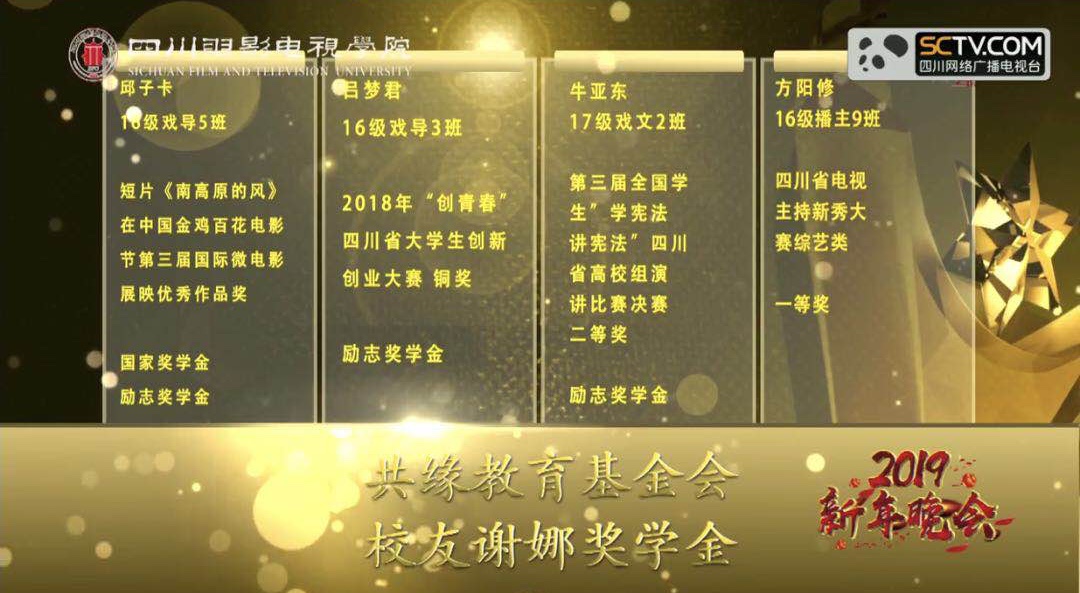 16级戏导3班吕梦君,曾获励志奖学金,获得2018年“创青春”四川省大学生创新创业大赛铜奖。17级戏文2班牛亚东,曾获励志奖学金,获得第三届全国学生“学宪法 讲宪法”四川省高校组演讲比赛决赛二等奖。16级播主9班方阳修,曾获四川省电视主持新秀大赛综艺秀一等奖。