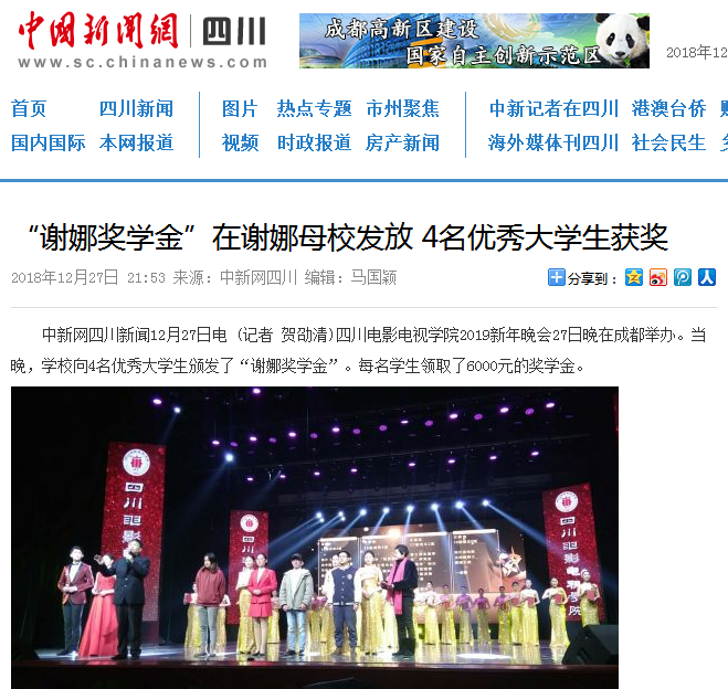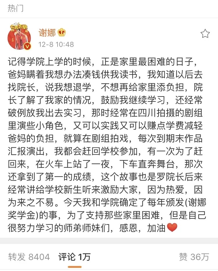 时间回到不久前的12月8日,一个重磅消息在微博、朋友圈刷屏,“亚洲综艺女王”谢娜在其微博宣布与母校川影确定了每年颁发“谢娜奖学金”的事,为支持那些家里困难,但自己很努力学习的师弟师妹们。微博一经发出,迅速窜上了热搜榜第一的位置。各大主流媒体也纷纷以“学子功成后反哺母校”为切入点,报道了这一正能量的事件。
