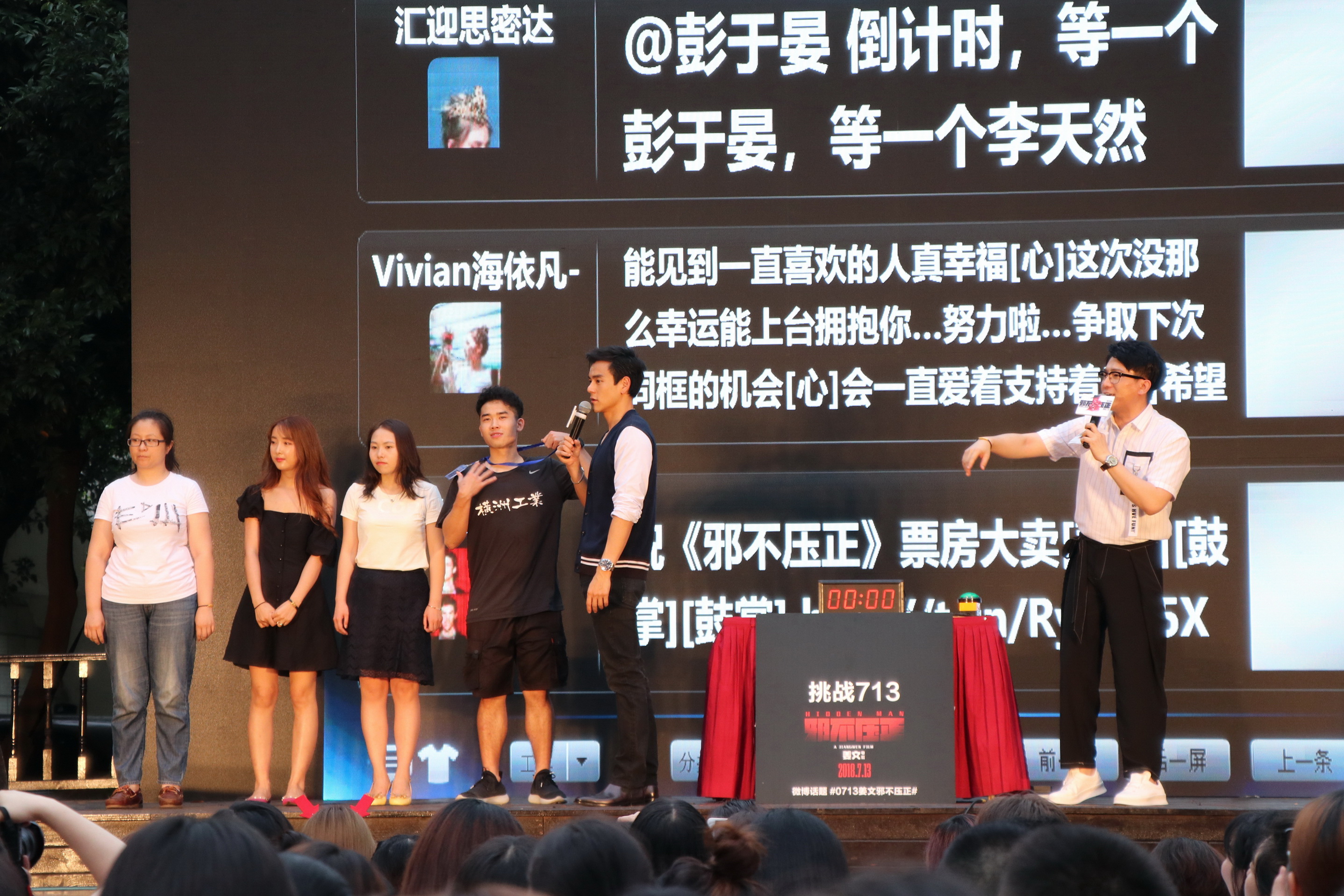 经过几个环节的互动,同学们已与彭于晏十分熟络,天生亲和的他在接下来的各项游戏中,总能引得同学们笑声不断,氛围活跃而融洽。现场还通过“微博”选人的方式挑选出上台的幸运同学。有同学在被彭于晏幽默问及此时此刻最想对父母说什么时,机智回应了作为粉丝的一颗小心心给彭于晏,她说:“感谢父母把我养这么大,来到这所学校,刚好在今天就遇见了你。”彭于晏多次称赞:“这学校不错,同学们聪明、活跃。”