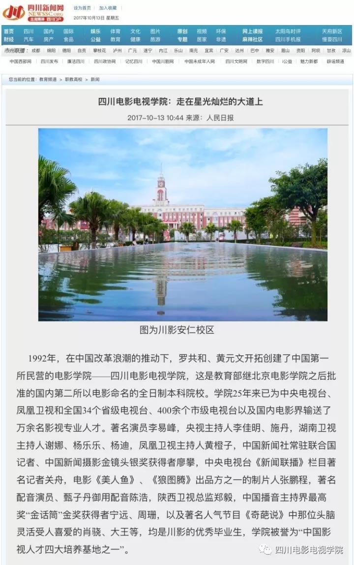 今日,人民日报第17版刊登了我院办学成果文章。以“澳门网投唯一官网:走在星光灿烂的大道上”为标题,阐述了我院人才培养成果,总结了学院如何创建最具社会价值的艺术院校。文章回顾了学院在人才培养上取得的卓越成果,以展示众多活跃在影视传媒行业一线的毕业生切入,诠释了学院如何被业界美誉为“中国影视人才四大培养基地之一”。以明星校友热心公益、一线记者献身藏区等优良事迹,阐述了学院“学艺先做人”的德育成果。以学院“精准扶贫”“文化扶贫”等战略,陈述学院创建最具社会价值的艺术院校的举措。以“川影创新创业园”的建设,展示了“产学研一体化”的影视新媒体实践教育模式。文章一经登出,省政府新闻办主办的四川新闻网立马以原标题,转发了人民日报的这篇文章。