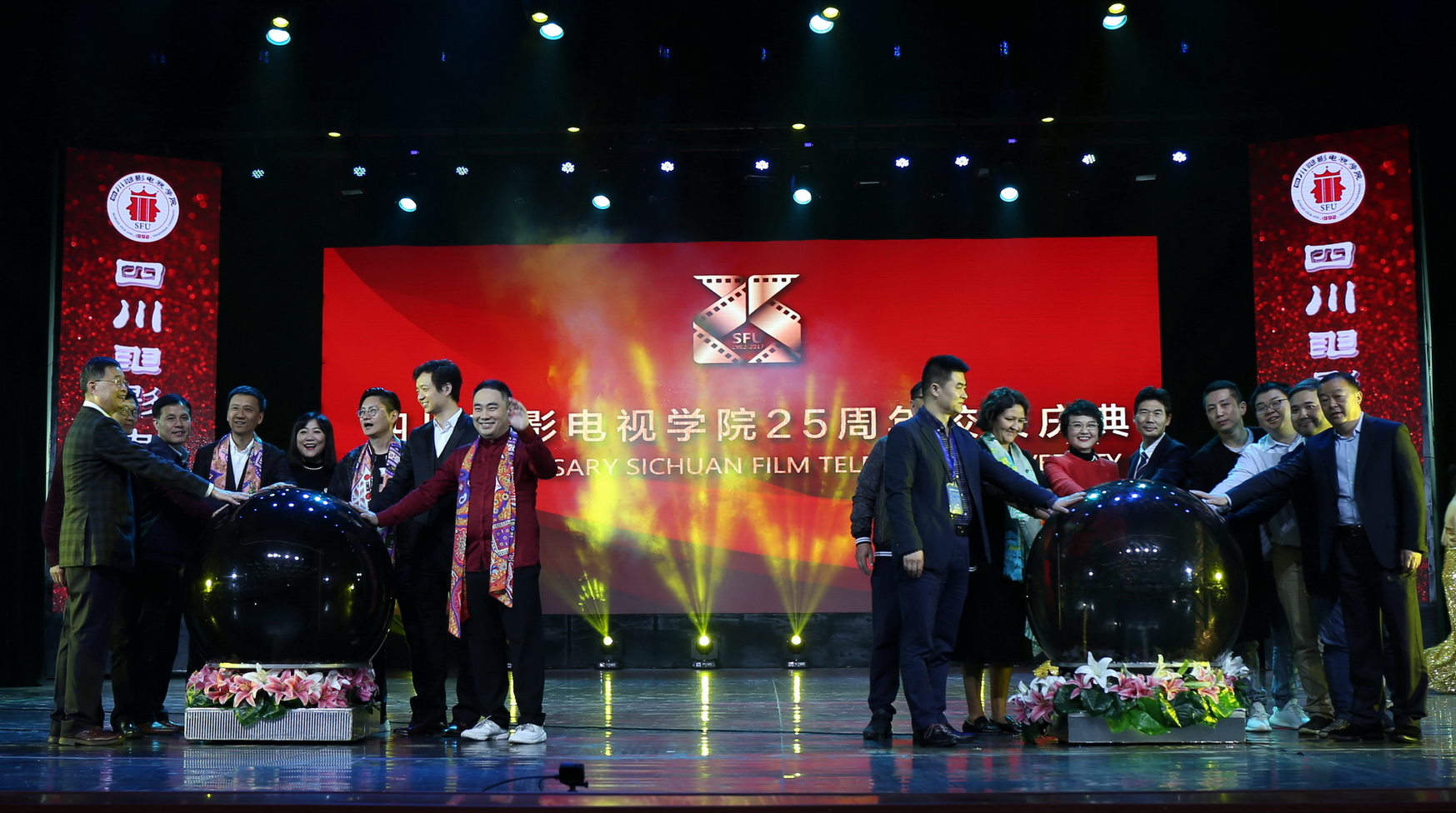 在川影25周年庆典演出现场,川影92级毕业生、中央电视台主持人李佳明,96级毕业生、湖南卫视主持人杨乐乐,98级毕业生、中央电视台主持人施丹,99级毕业生、成都电视台主持人袁莉,05级毕业生、安徽卫视主持人孙鹏飞,05级毕业生、上海东方卫视主持人伏玟晓,07级毕业生、《奇葩说》冠军肖骁,09级毕业生、陕西卫视主持人金鑫,07级毕业生、天津电视台主持人吴军,08级毕业生、安徽卫视主持人史百惠,10级毕业生、成都电视台主持人王婵,04级毕业生、影视演员、主持人杨迪分别搭档,上台担任庆典主持。