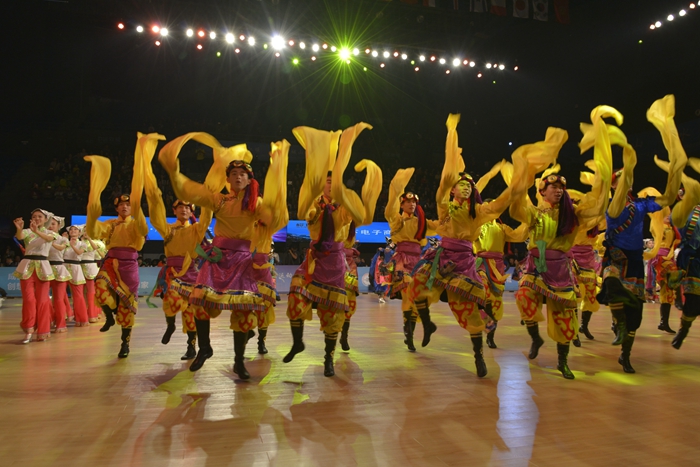更值得一提的是,如此高规格的世界级比赛现场,有太多川影学子的身影。川影舞蹈系学生在本届赛事下设的“世界体育舞蹈大赛形象大使选拔”中以绝对优势包揽了冠亚季军。9月23日晚,参加本届大赛的全世界200多名世界顶尖选手在都江堰南桥广场举行的赛前欢迎会——“都江堰之夜”活动中亮相,华丽的红毯秀与精彩的晚会吸引了上万市民观看,呈现万人空巷的盛况。其中,晚会全部的5个舞蹈节目均由川影舞蹈系学子表演,舞蹈《李冰父子情》是舞蹈系为晚会专门创作编排的,受到了都江堰市长的高度评价,希望将其作为保留节目在今后都江堰的重大活动上演出。同时,欢迎会的双语主持也来自川影播主系双语班。而在9月24日举行的开幕式的重头戏——开场舞上,我院舞蹈系学生更是上演了一出大型“羌彝藏”舞蹈《岷江风情》,受到了专业人士极高的好评。同学们在舞蹈系主任陈志惠老师的带领下,向世界观众展示了高品质的舞蹈。此外,50名川影同学承担起大赛的礼仪工作。学院播主系双语班更是派出45名志愿者在现场向来自世界各地的外宾做一对一翻译等服务!