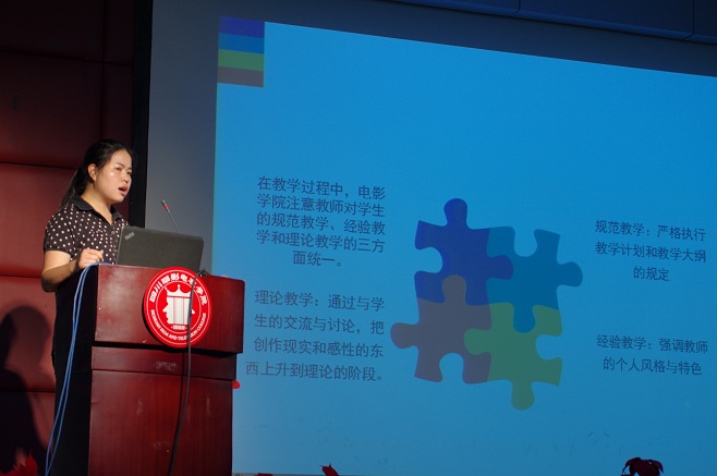 最后是在北影文学系学习的我院戏文系郭怡然老师进行分享。她提出了“思想决定命运”的思考,从课程设置、课堂教学、专题讲座、成果考核、教学改革及自我宣传六个方面展开论述。在课程设置方面,郭老师十分细致地研究了两校共有的课程及相互区别的课程,强调了教学与实践互动的重要性。令人印象深刻的是,郭老师结合市场需求,专门区分了两校培养目标与学院特色的差异,指出了川影值得借鉴北影的方面,以及应当坚持我院特色的方面。同时强调了学好“新媒体”的至关重要。