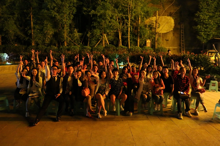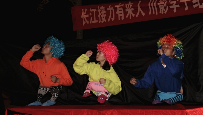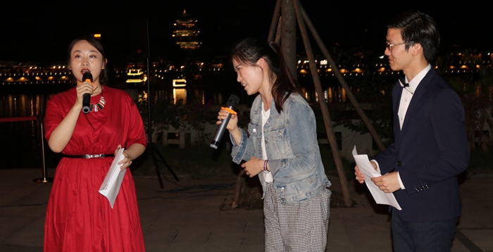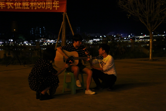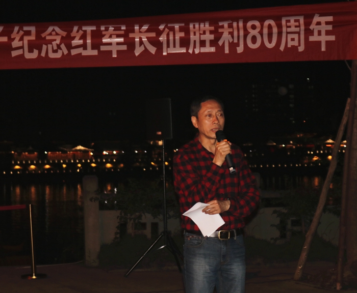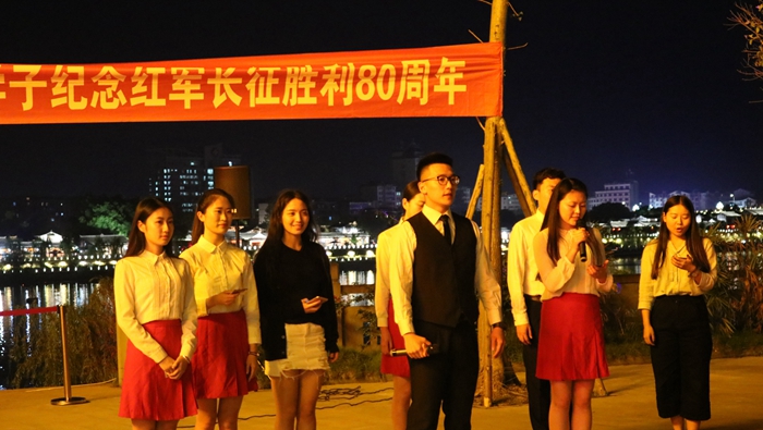 当日晚,师生们在阆中嘉陵江边举行了“长征接力有来人,川影学子纪念红军长征胜利80周年”晚会,在一首铿锵有力的《长征》朗诵中晚会开始,随后罗映光书记为大家讲述了在阆中长征中的故事,以及此行来到阆中的重要意义。在晚会中,播音系党支部成员特别根据主题进行了即兴思维表演,根据阆中历史文化中特有的“醋”、“张飞牛肉”和“贡院”与长征结合,讲出了红军不怕远征难的精神。