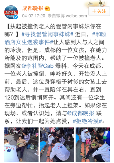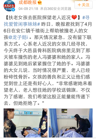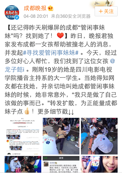事件发生后,受到媒体及网友们的高度关注,成都晚报也在网络上发起了“寻找爱管闲事妹妹”的“人肉搜索”,很快龙子懿同学就被找到。今年19岁的她,在川影读大一,记者在采访她时,她说:“自己做的只是举手之劳,希望能为这个社会传播一点正能量。”