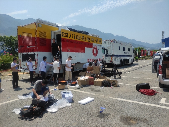 教学实验中心对参加本次演习积极准备,全面细致认真做好各方面工作。学校王霄老师提供系统工程技术支持,川影大型节目融创中心数名工作成员全程参与,顺利完成本次保障,为解决多路信号增加了多台视音频设备:40路4K切换台及矩阵各1套、切换台面板2台、高清录机5台、背包服务器9台、高清5G传输背包36套等,让各外来设备和转播车现有设备深度级联,实现要求的各项视音频需求,深度发挥提升了转播车现有的功能,顺利完成本次直播制作任务,同时实验中心通过这次深入一线的行业转播工作实践,也积累和总结了在演习演练这项领域的制作经验。