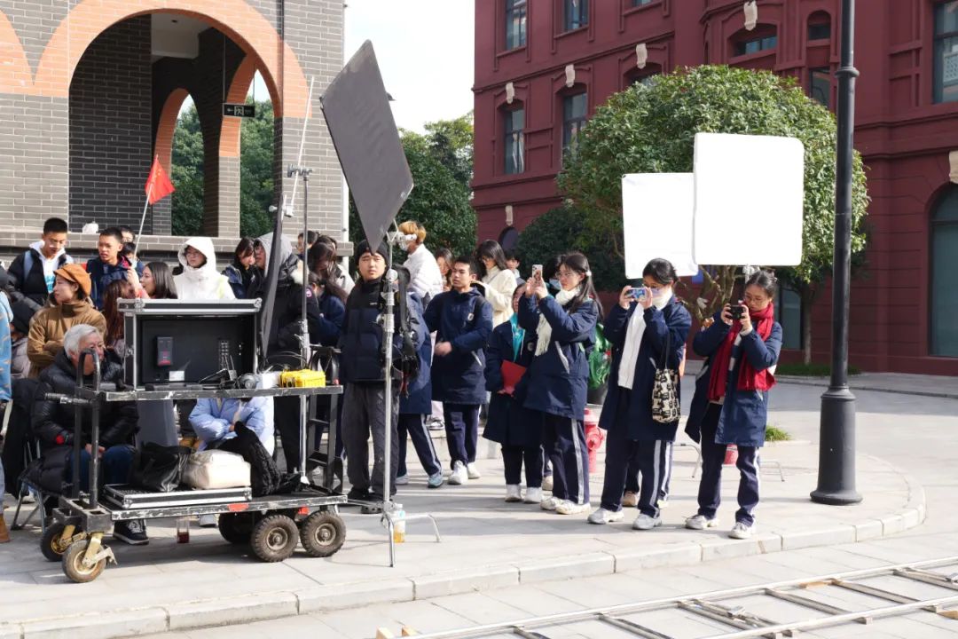 学生们来到电影学院外景拍摄点,进行电影拍摄过程的观摩。在现场,不仅见到了摄制中轨道的使用,演员对镜头的配合,还有监视器后面的导演如何进行现场导戏等。