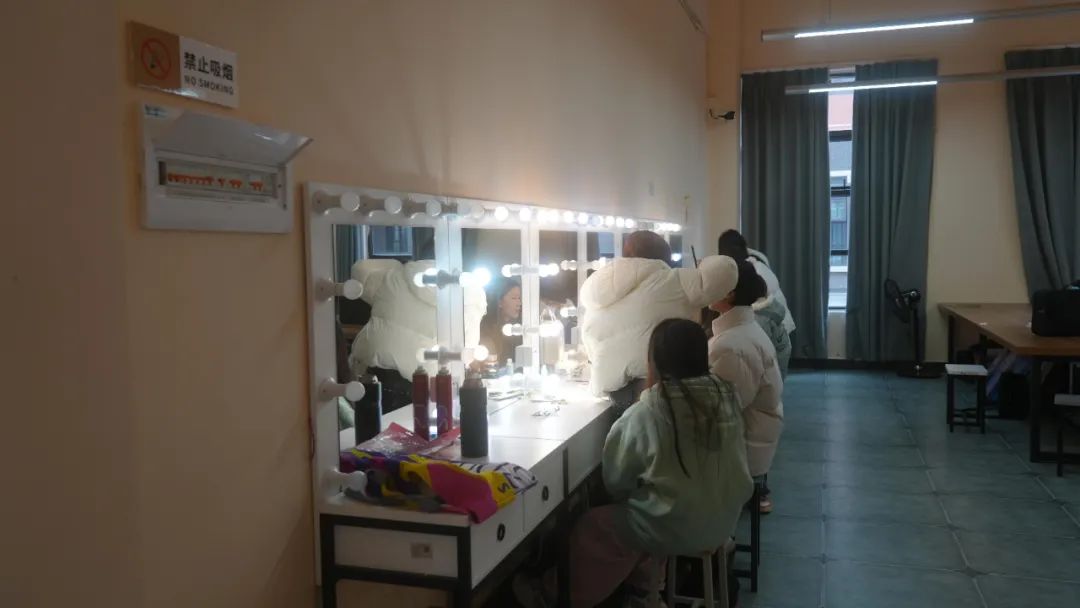 在人物化妆造型工作室,同学们观摩了电影人物化妆造型特效化妆创作过程,电影学院的学生将色彩颜料在皮肤上轻轻勾勒几笔,便画出了足以乱真的伤疤妆。“姐姐你化得真好!真厉害!”一位同学忍不住发出惊叹。