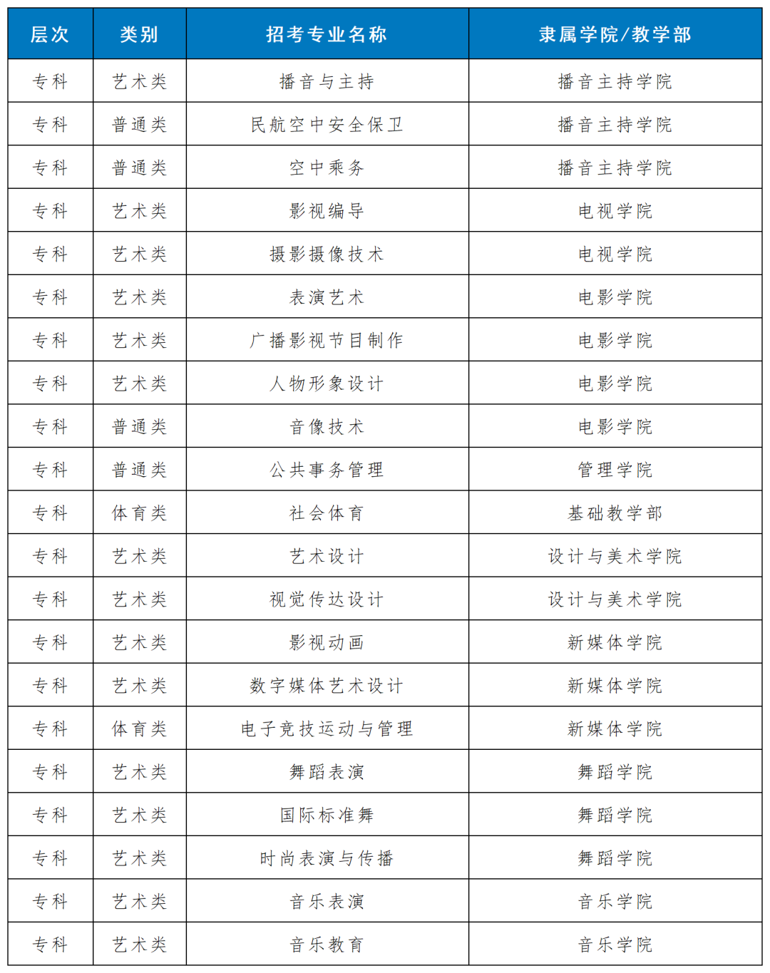 学校拥有10个二级学院和1个教学部、1个大学生创新创业中心,共开设25个本科专业、21个专科专业。形成了以影视传媒专业为主要特色,艺术学为主,教育学、文学、管理学等学科协调发展的学科专业结构。