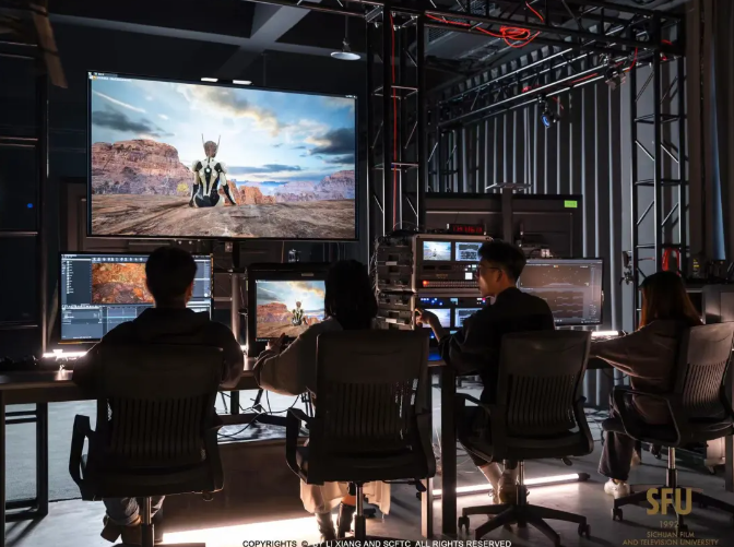 文创城内与业内一线公司重点打造的“数字虚拟制作棚”,形成完整的“剧本创作——内外景拍摄——后期制作发行”一体化大型综合性产教创融平台,实现教学功能和社会服务双重利用。