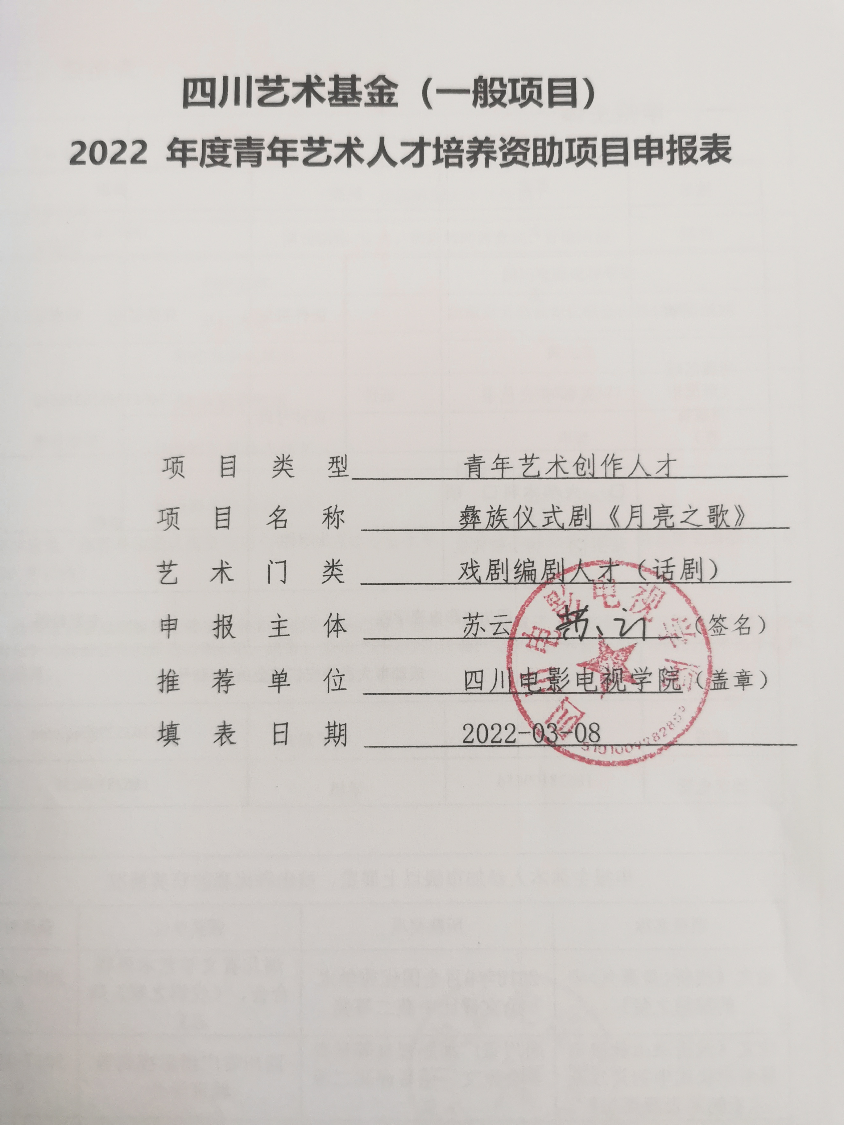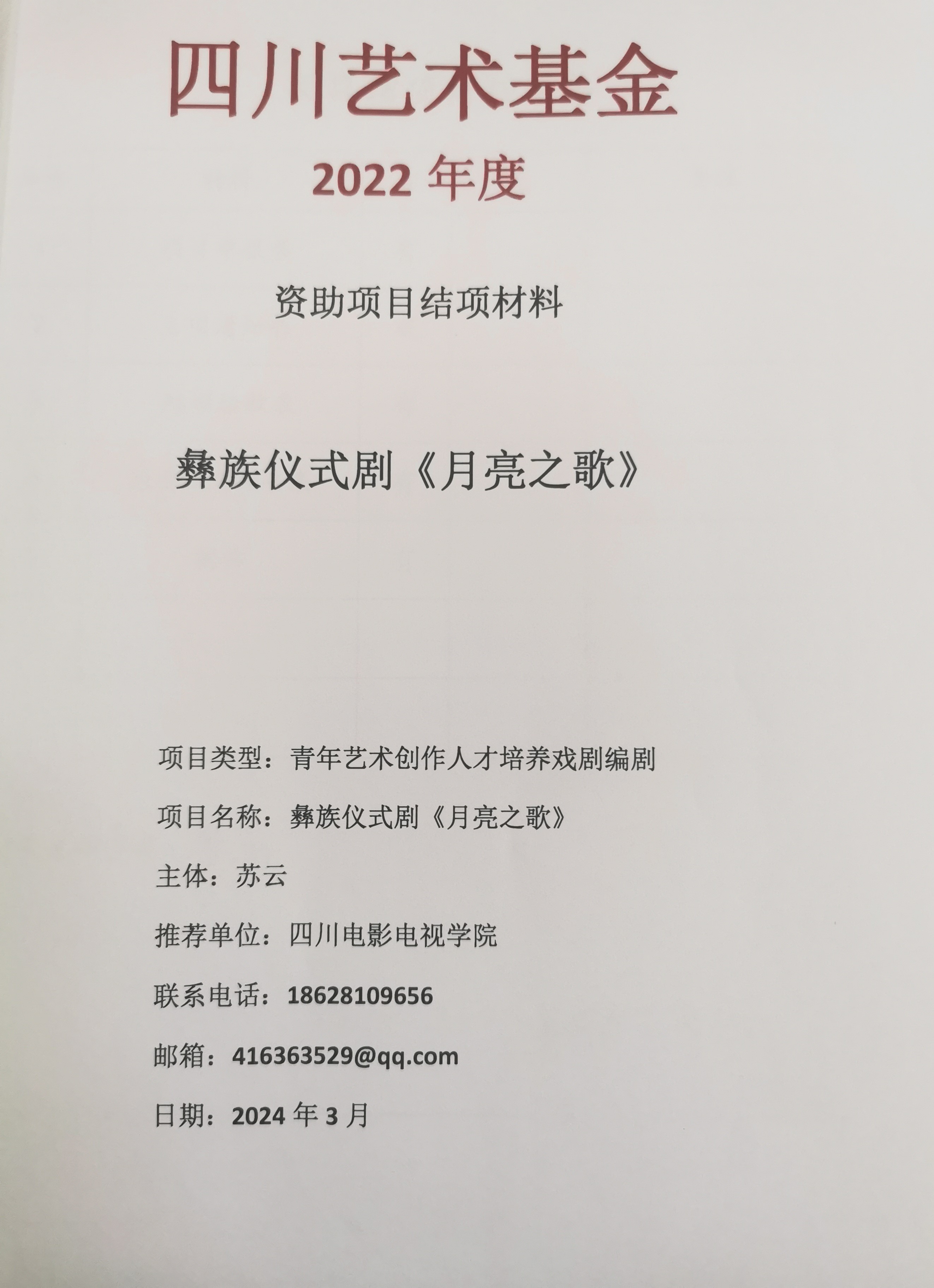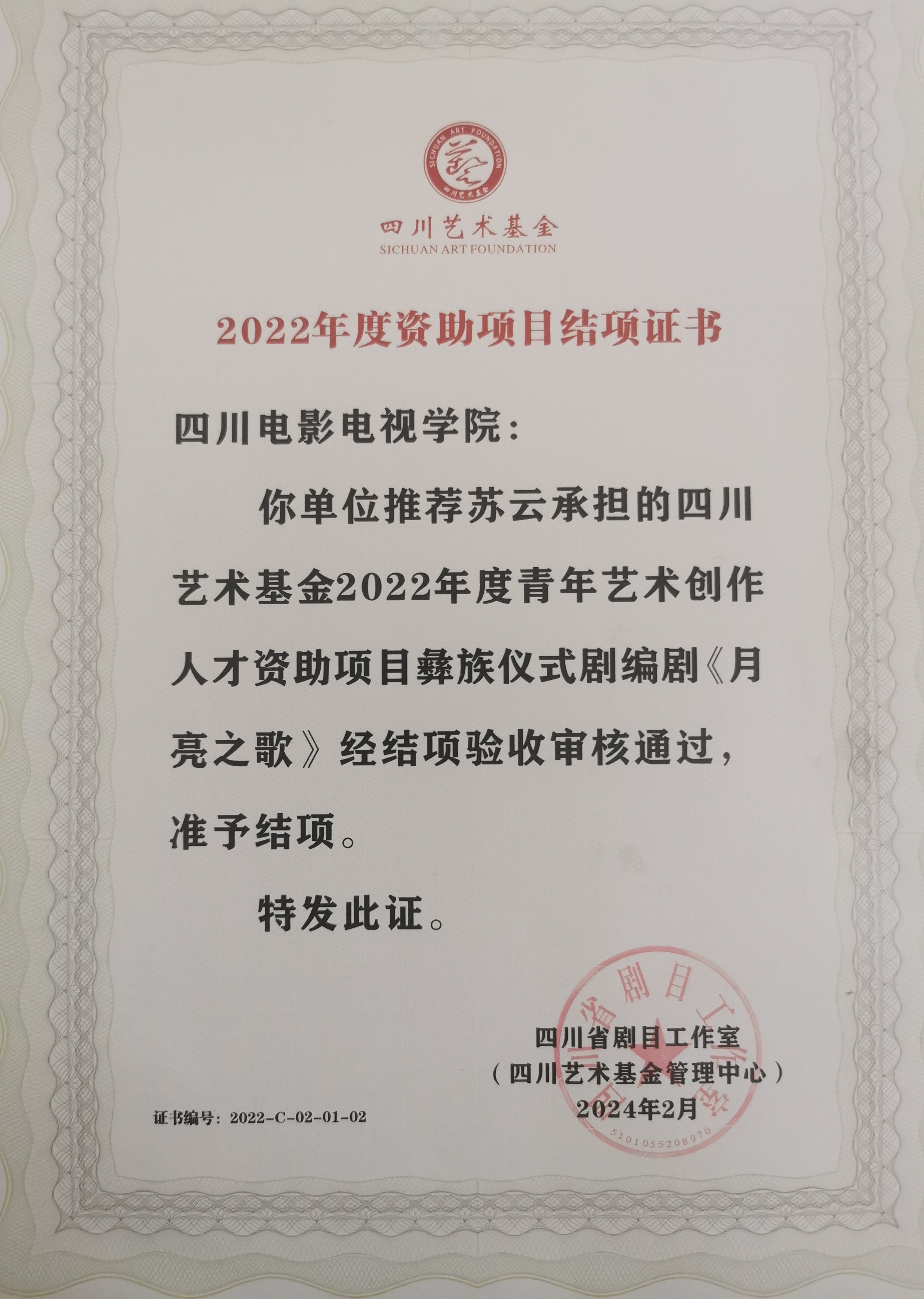 近日,我校电影学院苏云老师主持研究的四川艺术基金资助项目《月亮之歌》(项目编号:2022-C-02-01-02)经四川艺术基金管理中心评审正式结题。