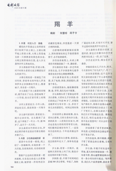 近日,我校国际创意学院办公室主任何慧珍副教授联合绵阳市安州区文化馆邱子卡共同撰写的电影剧本《羯羊》在全国中文核心期刊《电影文学》正式发表。该剧本系2023年度四川民族山地经济发展研究中心项目《以铸牢文化共同体意识为目标的四川民族地区影视文化传承与创新研究》(课题编号:SDJJ202321)研究阶段性成果。
