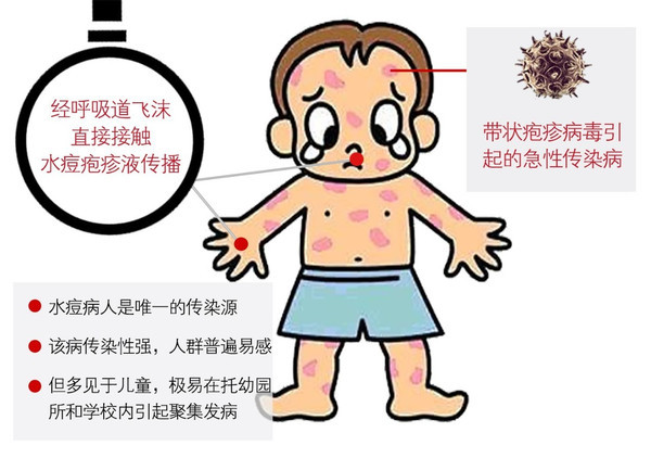 水痘是由水痘—带状疱疹病毒感染引起的急性传染病。在儿童时期,感染后表现为红疹点和水泡,病毒可潜伏于脊神经节;成年后,当机体抵抗力下降时,病毒可重新激活表现为带状疱疹。水痘易在学校、托幼机构等人群聚集场所暴发和流行。