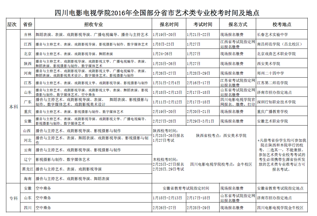 五、澳门网投唯一官网2016年艺术专业报名考试时间及地点
