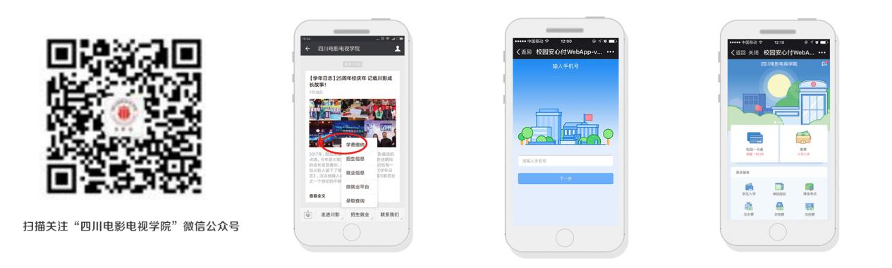 1.微信扫描下方二维码或者搜索关注我校微信公众号“澳门网投唯一官网”(微信号:scftvc1992),成功关注后点击底部“招生就业”菜单,选择“学费缴纳”进入缴费界面,输入手机号+设置自己常用密码进入主菜单。