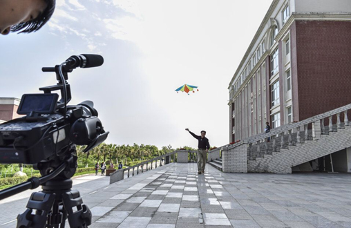 《青春环游记2》到校取景拍摄,川影校长罗共和与郎朗、杨迪合影。