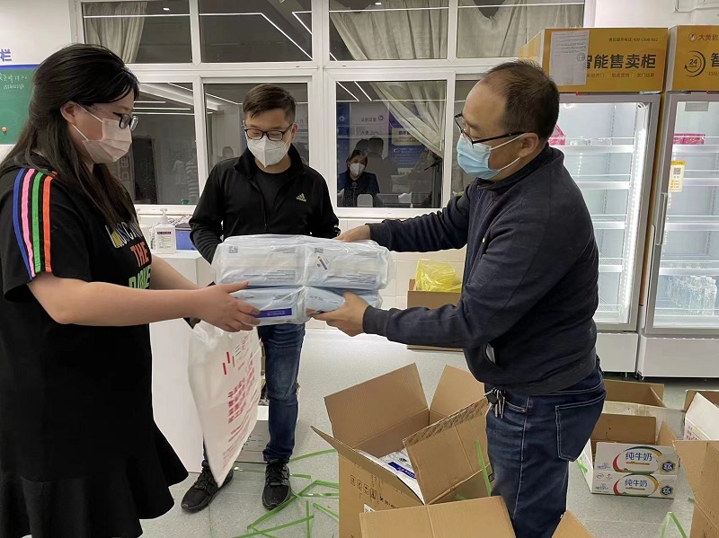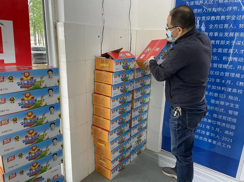 随着疫情的持续,各项物资都需要老师们为学生亲自送到寝室,王书记亲自给辅导员老师分发防疫物资,和辅导员老师一起给学生搬运生活用品,配餐送饭。做学生思想工作并安抚学生情绪,同时鼓励辅导员老师要克服困难,把工作压实做细,用责任与奉献为学生健康与平安筑建“防护墙”,大家一起勠力同心,共克时艰。