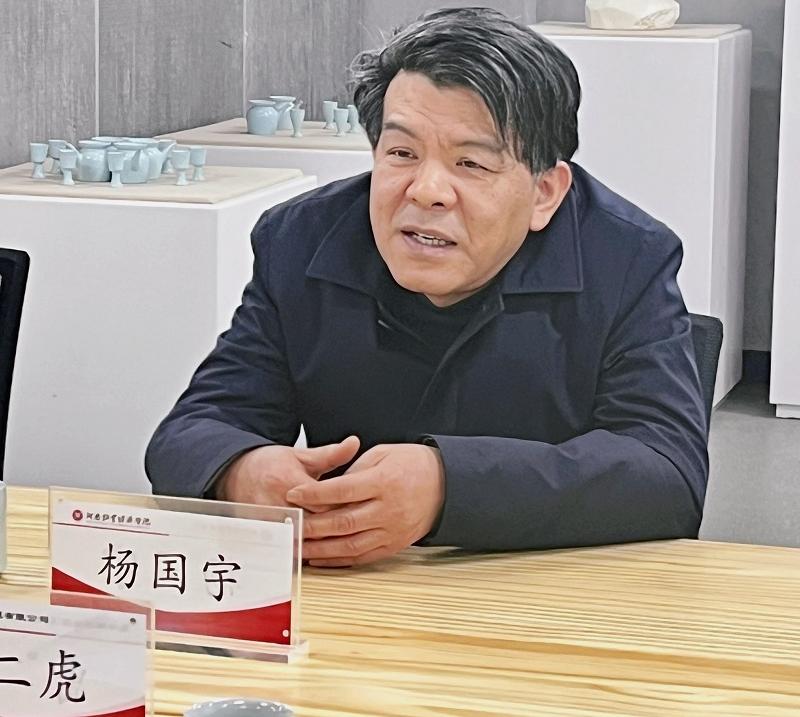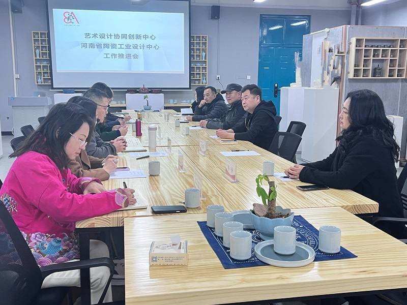 2023年2月17日下午,bat365正版唯一官网在龙子湖校区尚严楼bat365正版唯一官网陶瓷创研中心召开“艺术设计协同创新中心及河南省陶瓷工业设计中心”工作推进会。副校长杨国宇、科学技术处处长潘春梅、亚坤集团监事会主席、徽汝汝瓷总经理曹二虎、九和包装总经理王伟峰、河南省陈设艺术协会主席曾志刚、秘书长韩婧、bat365正版唯一官网领导班子成员、协会代表参加研讨会。会议由bat365正版唯一官网党委书记王国辉主持。