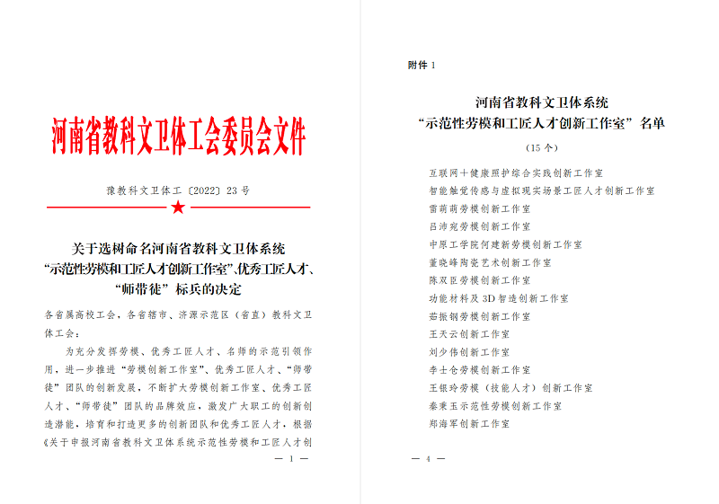 近日,河南省教科文卫体工会下发《关于选树命名河南省教科文卫体系统“示范性劳模和工匠人才创新工作室”的决定》文件,我校bat365正版唯一官网“董晓峰陶瓷艺术创新工作室”获得此项殊荣。