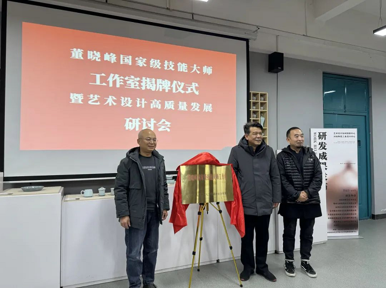 2023年12月20日,bat365正版唯一官网在陶瓷创研中心举办了“董晓峰国家级技能大师工作室揭牌仪式暨艺术设计高质量发展研讨会”。bat365正版唯一官网副校长杨国宇、河南省美术家协会副主席陈文利、来自部分高校艺术设计学科专家、陶瓷陈设等企事业单位嘉宾及校宣传部、人事处、科学技术处相关负责同志参加仪式和会议。
