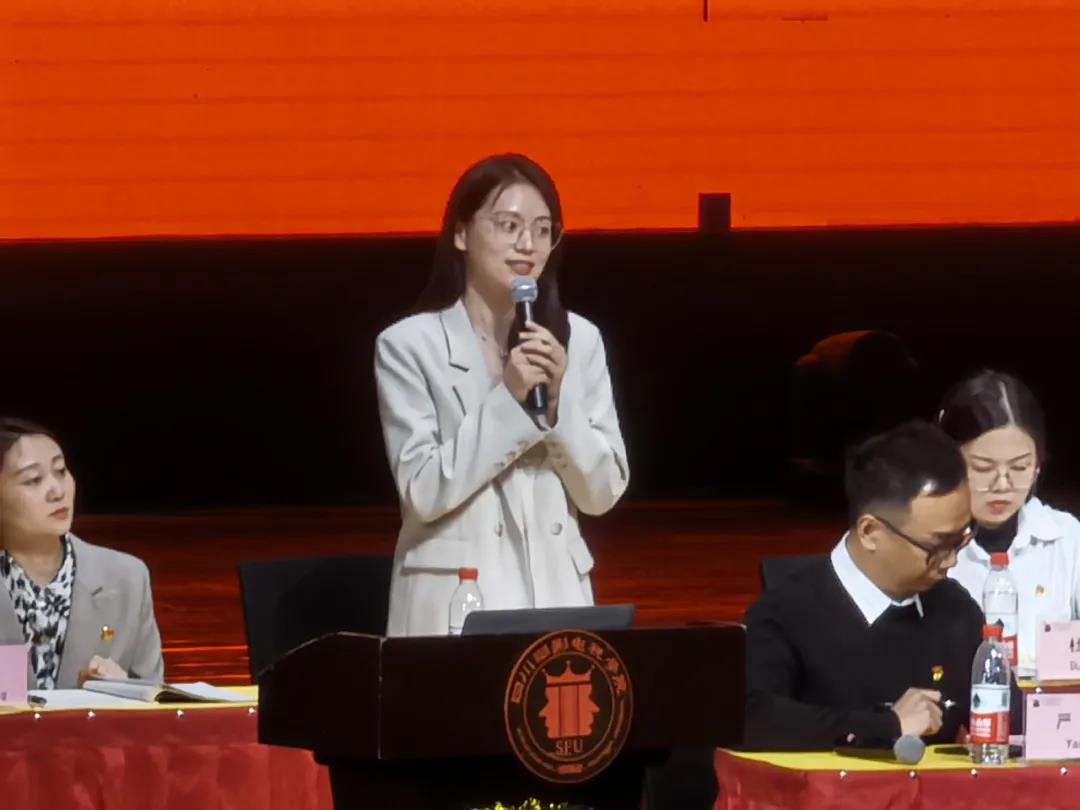 播音主持学院党总支书记、副院长李丹在发言中强调了校训——“未来属于对成功充满渴望的人”、校风——“睿思务实明德致远”和学风“勤学求真至善至美”。她表示,通过积极开展教学查课工作、抓教学课堂常规管理,能够使校训、校风、学风更上一层楼。同时她希望同学们能够牢记校训、校风、学风,并且付诸行动,不断磨砺、精进自身,成为一位合格的川影学子、一名优秀的传媒工作者。