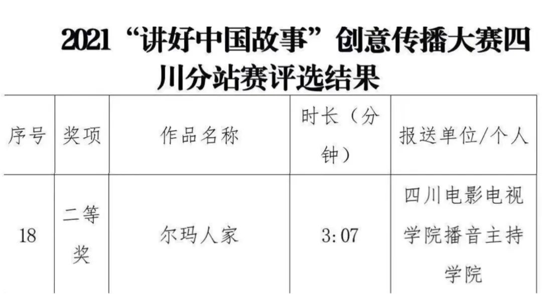 “讲好中国故事”创意传播大赛由国务院新闻办公室指导、中国外文局主办。其中,2021“讲好中国故事”创意传播大赛四川分站赛由四川省人民政府新闻办公室指导,当代中国与世界研究院、中国互联网新闻中心主办,封面新闻、华西都市报、中共成都市武侯区委员会、成都市武侯区人民政府共同承办。经过大赛组委会审查、网络投票、专家打分、定评会议等系列评审工作,最终,共有38部作品获奖。其中,我校播音主持学院学生的小组作品《尔玛人家》荣获二等奖。