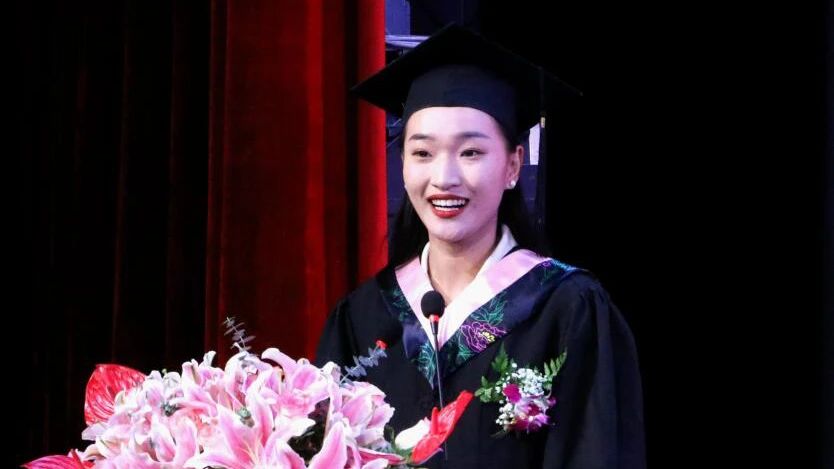 播主学院2023届毕业生、2019级播音与主持艺术7班的王艺霏同学作为毕业生代表发言,她感谢母校与老师的培养,她说,不论走到哪里,都会谨记母校的教诲,为社会做出贡献。也祝愿所有的同学在未来无论是顺境还是逆境,都能万事胜意,得偿所愿。