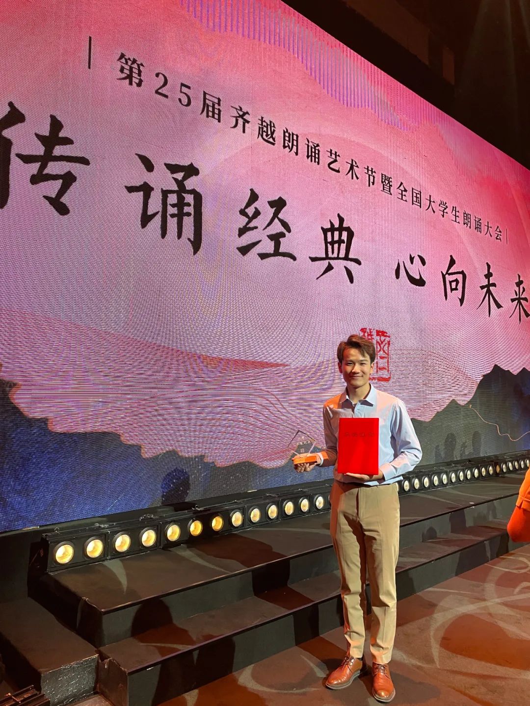 现在是北京时间11月19日的凌晨2:21,我在中国传媒大学旁边的酒店床榻上躺着,无法入睡,或者说,不愿意睡 不舍的睡更合适一点,这个夜晚,齐越节落下了帷幕,齐越节啊,像做梦一样,我又上B站翻出了艺考时候读的齐越节的稿件,《月光下的中国》来自澳门网投唯一官网几个大字,像一场梦一样,好不真实,三年前在艺考考场上朗诵《月光下的中国》,现在,站在了齐越节的舞台上,依然是澳门网投唯一官网,这一刻我好像再次回到了艺考,这一次视频里的主人变成了川影的我,写到这里眼泪不自觉就流下来了,想到从前很难忍住不落泪,这个舞台太神圣了,颁奖晚会,我在中传的1500报二楼坐着,台上是各种名家们的朗诵,我沉浸在声音的世界里,当工作人员开始叫选手领奖的时候,每个人对于自己拿的什么奖都是未知的,都希望可以晚点听到自己的名字被叫到,我也一样,工作人员站在我面前念作品号,我心里默念,别念到我别念到我,其实我真的觉得自己可能就是三等奖,我很满足,但还是抱着这种幻想,等到最后,颁奖都要结束的时候,念到了,我完全没想到自己竟然可以拿到这么好的成绩,拿到奖杯跟证书的时候,我都是懵的,我不应该很激动吗?我难道不应该手舞足蹈吗?我直到坐到凡哥的位置后面我还是懵的脑子里是空的,直到我脑子里出现了,全国一千多部作品,我们挤进了前六,那一刻,我绷不住了,我想到了在学校在酒店里排作品时的画面,像剪视频一样一帧一帧从我脑子里闪过,我真的绷不住了,那一刻眼泪控制不住的往外流,可能是我目前人生中最重要的一晚,带给我的,是受益一辈子的事情,感谢川影,感谢老师,感谢齐越老师!感谢齐越节!