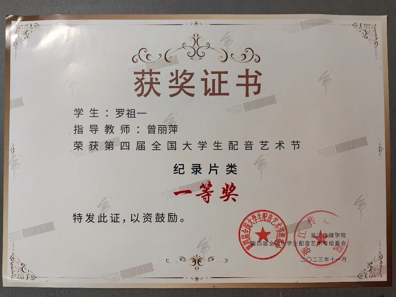 2023级播主5班罗祖一荣获纪录片一等奖