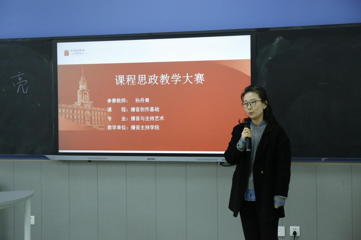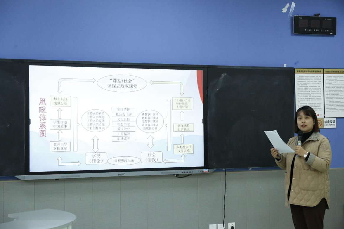 随后,三位教师代表进行了说课及教学展示来自主持教研室的任云芳老师介绍了《主持人学》课程,包括节目主持概论、主持人基本功和各类主持人的实训,任云芳老师就“文化自信有传承,社会服务有担当”主题,讲述“我的家乡美”将如何进行文案创作设计。